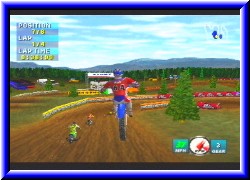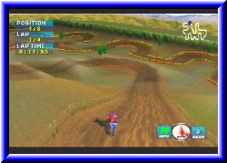 Denn leider ändert sich die Steuerung auch im höchsten Schwierigkeitsgrad kein bißchen. Zudem ist die KI der Fahrer nicht sehr hoch. So fahren sie nach dem Start gerne mal in die falsche Richtung bei der ersten Kurve. Schon lustig. So ist selbst der Gewinn der höchsten Klasse im schwersten Schwierigkeitsgrad kein Problem. Einziger Unterschied ist das im höchsten Schwierigkeitsgrad Jeremy McGrath ein schwerer Gegner ist. Aber durch die angesprochene leichte Steuerung ist auch er am Ende kein Problem. Wer sich Zeit nimmt hat das Spiel in einer Nacht im 1P Modus komplett durch. Das gilt auch für die Outdoor Strecken. Diese machen aber noch ein wenig mehr Spaß und überzeugen durch eine exzellente Streckenführung. Bergauf und Bergab mit vielen Sprüngen und Buckelpisten kommt hier Fahrspaß auf. Auch hier sind Stürze eine absolute Seltenheit. Denn auch hier werden verkorkste Sprünge oder Berührungen mit der Bande