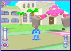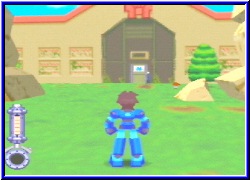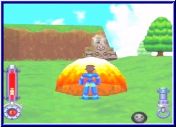 Neben Barrel Casket auch weniger positiv gesinnte Kräfte. Gerade auf einer der Reisen zwischen den Inseln müssen unsere Helden auf einer Insel notlanden um dort die Ersatzteile für ihren Flieger zu bekommen. Was als Reparaturlandung begann stellt sich schnell als Einsatz für das gute heraus. Denn durch Zufall sind unsere Helden auf der gesuchten Insel gelandet und stehen nach und nach dem Bösen auf der Suche nach dem Mother Lode gegenüber. Soweit die Story die zu Beginn auch in Form eines Vorspanns gezeigt wird. Nachdem man so das erste mal Kontakt mit den Personen des Spiels bekommen hat beginnt auch euer Teil des Spiels. Der Hauptbildschirm des Spiels offenbart neben dem Spielstart die Load Option sowie die Options. Die Options bieten euch die Möglichkeit neben dem Sound Mode die Steuerung zu verändern, die im Verlauf des Spiels zwar ungewohnt aber doch praktisch gehalten ist. Was mich in diesem Zusammenhang sehr gewundert hat ist das man bei Capcom Handbuch und Spiel nicht mehr abgeglichen hat. Zunächst steht im Handbuch das Spiel bei Screens unter Mega Man Legends, also einer Anlehnung an die PSX Version, sowie unterstützte Geräte die aber in Wahrheit nicht unterstützt werden. Controller Pak wie Expansion Pak sind angegeben, lassen sich aber nicht nutzen, was im Falle des Expansion Pak auch nichts mehr genützt hätte. Aber dazu später. Nachdem die Vorgeschichte angelaufen ist findet man sich das erste mal neben dem gestrandeten Flieger wieder und trifft die Personen Barrel und Roll wieder. Aber auch ein anderer Charakter zeigt sich. Der kleine Affe Data . Bei ihm kann Mega Man wenn er ihn trifft punktgenau speichern, wobei 16 Savegames auf der Batterie möglich sind, Fragen zu allem möglichen stellen und vor allem wenn er nicht weiter weiß. Hängt man also im Spiel fest hat Data immer einen Tip parat. Data taucht aber nicht fortwährend auf, sondern immer in gewissen Abständen. Grob gesagt muß sich Mega Man in den folgenden Abenteuern auf der Insel bewähren, für die man jederzeit eine Karte aufrufen kann. Um alle Teile der Insel begehen zu können muß Mega Man im Verlauf des Spiels erst sogenannte Lizensen bekommen um die durch Türen gesicherten Abschnitte der Insel betreten zu können. Zentrum ist die große Stadt die allein schon mehrere Abschnitte in sich bildet. Zieht Mega Man am Anfang los hat er nichts außer einer kleinen Waffe. Alles was es an Waffen und Ausrüstung im Spiel gibt muß er sich verdienen, erkämpfen oder finden. Auf dem Screen sieht der Spieler dabei immer feste Anzeigen.
