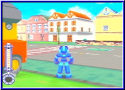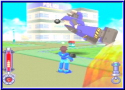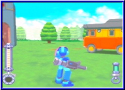 Gewechselt werden diese in einem kleinen Laster , den Ihr im Spiel erst finden müßt und den Roll dann steuert. Erst jetzt habt Ihr alle Möglichkeiten die das Spiel bietet zurVerfügung. Auch dieses Feature empfinde ich als gut gelöst. Denn diese Waffen bekommt Ihr weder geschenkt noch könnt Ihr sie kaufen. Einzig Roll kann sie euch zur Verfügung stellen. Dazu findet Ihr immer wieder im Spiel verschiedene kaputte und fehlerhaft Teile. Sucht man jetzt den Support Car auf steht euch bei Roll ein Menu zur Verfügung. Hier drinnen kann Roll aus diesen Teilen nun Waffen entwickeln, die Ihr hier auch anlegen könnt. Diese Waffen reichen vom Raketenwerfer über Minen bis zu Sprengbomben. Von der Wirkung her wesentlich effektiver als die normalen Waffen. Dafür besitzen sie die angesprochene Anzeige auf dem Spielscreen und sind nicht ewig nutzbar. Ebenso könnt Ihr hier im Support Car die Level jeder Waffe bei Roll gegen Bares pushen und so ein anfänglich laue Spezialwaffe extrem pushen. Das ganze ist auch notwendig da im Verlauf die Gegner doch stärker werden. Das Spiel selber ist so angelegt das Ihr durch begrenzte 3D Arenen lauft und kleinere Aufträge und Rätsel löst und danach immer einen Endgegner habt. Diese Gegner tauchen sehr oft auf, so das man sehr oft keine lange Pause hat zwischen solchen Kämpfen. Dabei muß man jedesmal zunächst eine Aufgabe lösen bevor man zum Endkampf antritt. So muß man z.b. aus kleinen Panzern in einer bestimmten Zeit einen Schlüssel herausbomben oder die Gegner daran hindern Gebäude der Stadt zu zerstören. Erst wenn man diese Aufgaben gelöst hat erwartet einen der Endgegnerkampf. So ist das Spiel im Endeffekt weniger ein Adventure im eigentlichen Sinne, sondern eine hohe Anzahl an Endgegnerkämpfen bei denen die unterschiedlichsten Taktiken zum Erfolg führen. Jedesmal danach erhält man eine Belohnung und hat einen Bereich der Insel gesäubert. Erst jetzt folgen kleinere Rätseleinlagen und auch sich ändernde Locations. So verschlägt es Mega Man sehr oft in unterirdische Dungeons, wo die Refractor Energie verborgen ist. Nachschub an Geld erhält man hier übrigens beim zerstören der normalen Gegner im Spiel, die in Form von Panzern, fliegenden Dronen oder