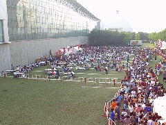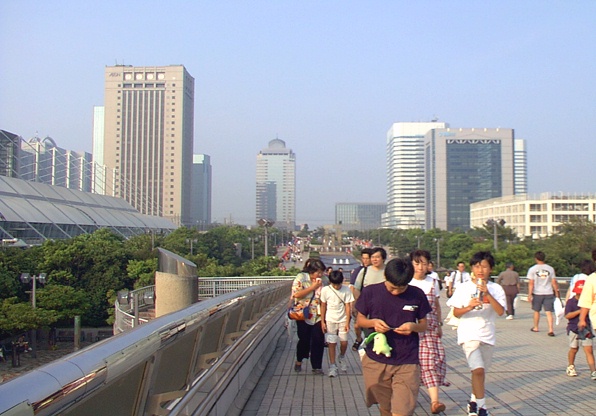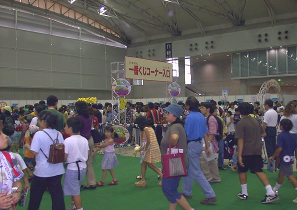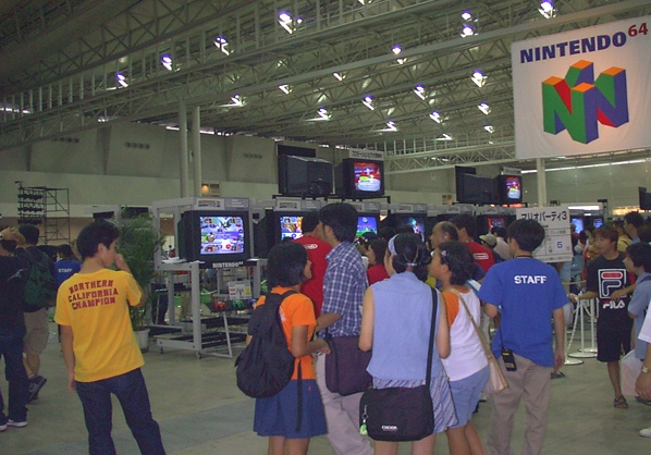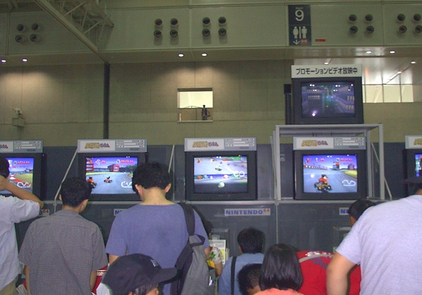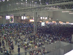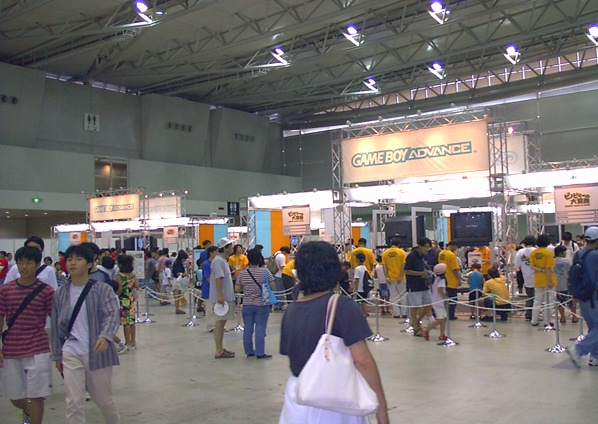Nachdem man nun jahrelang immer in der Fachpresse deren Erlebnisse passiv nachlesen mußte und man sie doch immer um ihre Reisen ein wenig beneidete ging nun auch für uns ein großer Traum in Erfüllung. Endlich mal zu einer der wichtigsten Messe zu reisen, auf der Nintendo einen neuen Teil seiner Geschichte einläutete. Und mit dem GBA und dem Nintendo GameCube waren das nun bei weitem keine kleinen Fische. Im Vorfeld mit der offiziellen Einladung zur Pressekonferenz am Vortag der Spaceworld ausgerüstet ging es also nach Tokio in die Heimat Nintendos. Das mein Eintreffen erst nach dieser Pressekonferenz lag sollte sich im Nachhinein als nicht so schlimm herausstellen. Denn die Einladung öffnete auch an den offiziellen Tagen der Spaceworld noch einige Türen. Das Messegelände selber liegt im imposanten Stadtteil Makuhari, im Süden Tokios. Schon der Weg dorthin war die reinste Weltreise. Denn klein ist Tokio bei weitem nicht. Und leicht zu finden inmitten unzähliger Messehallen und Bürotürme war es auch nicht. Pünktlich 9:00 Uhr zur Eröffnung erreichte ich die Messe dann nun doch und man brauchte eigentlich nur nach den Menschenmassen zu gehen, die hier herumwuselten. Die Messe selber fand in den Hallen 9-11 statt und war praktisch in einer riesigen Halle als ganzes untergebracht. Über einen Seiteneingang, der eher wie ein Lieferanteneingang aussah gelangte ich in die Messehalle. Hier gab es die nötigen Pressekarten, die später den Zugang zur 2. Etage ermöglichte. Der erste Eindruck nach betreten der Halle war ein Erlebnis an sich. Schon einige Messen gewohnt war alles ein paar Nummern größer und imposanter. |