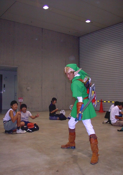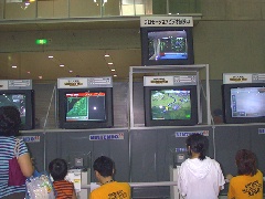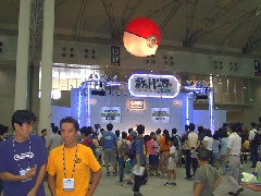 Auch gab es hier reichlich zu trinken, was mehr als wichtig ist. Denn wenn man eines immer hat, dann Durst. :-) Mein erster Besuch galt den GBA Ständen, wo ich mich nun endlich selbst mal davon überzeugen konnte was es heißt in langen Schlangen für ein paar Minuten Spielzeit anzustehen. In richtigen eingezäunten Wegen mußte man warten bis man dran war. Überall an jeder Ecke standen Nintendo Mitarbeiter, die ausnahmslos jünger als 20 waren, und die einem immer mit einer Verbeugung und netten Gesten den Weg wiesen. War man dann endlich dran wurde man wieder eingewiesen und es stand nun auch bei jedem GBA ein Betreuer, der nach jedem Spieler erstmal den GBA saubermachte. Jeder Stand umfaßte immer ein Spiel, das man an mehreren Stationen spielen konnte. Dabei wurde einem auf englisch das Spiel erklärt und danach in Ruhe gelassen. Für Nachfragen standen sie aber immer bereit. Mein erstes Spiel war Mario Kart Advance, das entgegen der anderen Spiele schon per Link Kabel gespielt werden konnte. Immer 4 GBA's wurden an einer Station zusammengehangen und man spielte gegen 3 weitere Besucher. War ein toller Moment das erste mal den neuen GBA in der Hand zu halten und die Grafik zu genießen. Man ist wirklich überrascht was die kleine Kiste alles drauf hat. Effekte und eine ungewöhnliche, aber klare Grafik erfreut das Auge. Ein sauberes Scrolling und eine ungewohnte aber tolle 3D Tiefenwirkung, die bei anderen Spielen noch weit besser zur Geltung kam. Den Ton konnte man überall per Kopfhörer genießen. Nachdem ich 2 Runden lang geführt hatte und mit der Driftsteuerung wunderbar zurechtkam zeigten mir viele rote Panzer, das man auch 3 Plätze verlieren kann in der letzten Runde. Gekicher links, gekicher rechts und man fühlt sich wie zuhause auf dem Sofa. Nach einer 2. Runde wurde man freundlich zum Ausgang des Bereiches geleitet und es wurden die nächsten an die Stationen gelassen. Die meisten Leute in den Schlangen vertrieben sich die Zeit mit GB Spielen oder Lesen verschiedener Zeitungen und Prospekte. Einmal stand ich auch wieder in der Schlange und irgendwas berührte mich dauernd am Hintern. Nachdem ich Anfangs dachte es wird halt ein wenig eng hier drehte ich mich dann doch mal um und sehe einen kleinen japaner nicht älter als 7 oder 8 hinter mir mit seinem Game Boy stehen. Daran war eine Kordel mit einem Anhänger befestigt. Das mich diese Kordel dauernd berührte lag daran das der kleine Kerl Kirby's Tilt'n Tumble spielte, das man ja durch Bewegungen der GBC steuert. |