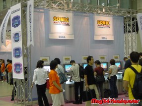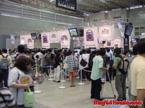 Schlimm wurde es am Besuchertag, wo schreiende japanische Kinder zu ihren Pokemons wollten. Das müßt Ihr mal gesehen haben. Das ist echt schon Religion. :-) So bestand der Medientag aus Gängen von einem Stand zum anderen um alle Spiele mal anzuspielen. Was wiegesagt an diesem Tag noch funktionierte. Und schon die Überleitung zum ersten Besuchertag gefunden. Voller als im letzten Jahr präsentiert Nintendo seinen neuen Highlights den Japanern, die das auch reichlich annahmen. Und da waren auch wieder die berühmten Absperrungen und aufgereihten Schlangen um mal 10 Minuten spielen zu können. Trotzdem alle sehr geduldig, bis auf die Kinder die wie ich am Vortag am liebsten alle Stände mit einmal besucht hätten. Aber für die jüngsten hatte Nintendo ein großes Programm. Neben den Pokemons z.b. spielte der DVD Player die neuen Kirby Zeichentrickfolgen ab, was sofort für eine große Traube Kinder sorgte. Die Schlange am Smash Bros DX Stand möchte ich garnicht groß umschreiben. Gigantisch. Als gäbs für Raucher die letzten Zigaretten auf Erden. Auf der großen Bühne lief ein Showprogramm nach dem anderen, wobei die Japaner Lautstärken entwickeln die uns nur noch Kopfschütteln abtrotzen. Naja und ein Schmunzeln dazu. Sobald irgendein Nintendo Charakter verkleidet auf die Bühne kam war Schluß mit Lustig. Dazu Show’s rund um den Gamecube damit alle was davon haben. Und dann der schon angesprochene Moment des symbolischen Handschlags. Mario, Sonic und weitere Charaktere aus Super Monkey Ball oder Hamutaro versammelten sich. Dazu Captain Falcon und natürlich Link. Auch hier konnte man drauf warten das Kinderhände nach den riesigen Charakteren greifen und schreiend ihre Eltern in den Wahnsinn treiben. Auf GBA Seite war Tekken einer der meist umlagerten Stände. Ebenso wie Mario Advance 2 oder Fire Emblem, der ja nun in Japan auch kein unbekannter ist. Beim GameCube waren logischerweise die Starttitel und anderen Nintendo Titel begehrte Plätze. Wobei bei allen Ständen von Fülle geredet werden darf. Wiegesagt mehr als im letzten Jahr. Wenn man sich nun wieder überlegt das Nintendo seine Erstmenge an Cubes in Japan auf 500.000 Stück reduziert hat bin ich auf den Marktstart gespannt. Wie immer konnte man auch diesmal wieder in der Fanartikelabteilung arm werden. Da wo tags zuvor der Getränkestand war, wurde nun all das verkauft was bei uns als Schnickschnack durchgehen würde und was die Japaner aber scheinbar so sehr lieben. |