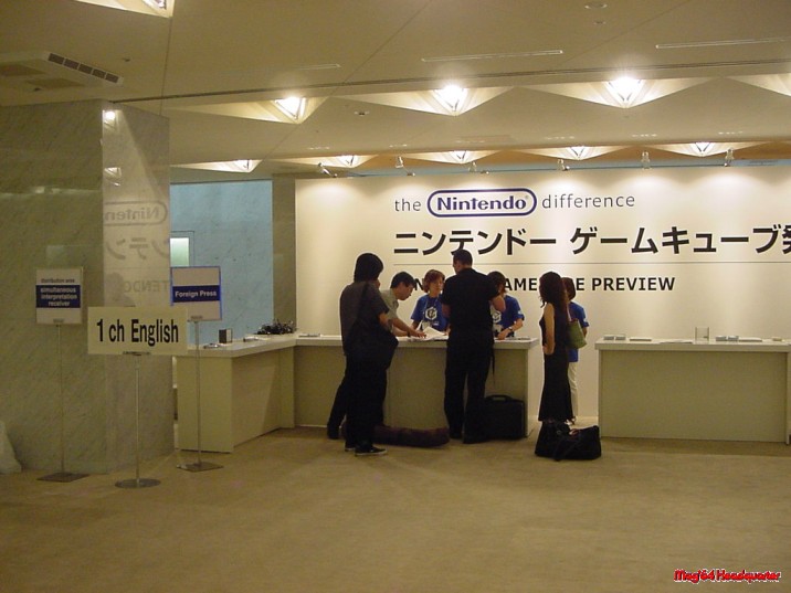 Auf jeden Fall aber ein Gebäude das imposant genug war für den Anlaß, auch wenn die imposante Bauweise Geschmackssache ist. Glücklicherweise war ich etwas zu zeitig da, was meine Anmeldung recht easy und vor allem schnell machte. Mit einer speziellen Karte ausgestattet verging dann allerdings knapp 1 Stunde ehe man sich ein wenig umsehen konnte. Wie ein Kinosaal abgesperrt konnte ich doch vorzeitig mal einen Blick in die Halle lassen. Imposant und doch ungewöhnlich gebaut alles. Vorne eine große Bühne samt dem großen Logo des GameCube links und rechts. Eine riesen Leinwand um später höchst interessante Dinge zu zeigen, sowie das Rednerpult für die illustren Gäste die sich hier später zeigen sollten. Links und rechts an den Seiten der Halle waren die Spielstationen für den GameCube, um den es hier auch nur ging. Der GBA spielte überhaupt keine Rolle. Jeweils hinten in den Hallen standen 2 Kameraplattformen für die Fernsehteams, wo auch ich mich hinverkrümelt habe und somit die Kamera voll ausnutzen konnte. In der Mitte waren kleine runde Partytische aufgestellt, die später auch gut gefüllt waren. Gleich neben dem Eingang der Halle waren Vitrinen mit den Objekten der Begierde aufgestellt. Diesmal alles als finale Hard&Software ausgestellt. Vom GameCube selber in allen Größen und Variationen, wobei mir das Orange so garnicht zusagte. Aber in Japan wird diese Farbe sicher ein Renner. Dazu vor allem die Spielepackungen und die der Hardware. Man ist echt erstaunt wie klein der GameCube Karton ist. Dagegen war die N64 Verpackung ein echter Klopper. Schön waren nun endlich die kompletten MemCards die gezeigt wurden. Diese hatte man ja selbst auf der E3 zart vergessen. Die Spielepackungen sind kaum größer als aufgestellte japanische GBA Pakungen. Sieht man daneben aber endlich mal die kleine fertig beklebte Disc weiß man auch warum. Alles ein wenig ungewohnt für uns Nintendo Spieler. Aber solange unsere Spieleträume darauf schlummern solls uns wurscht sein. :-) Wie es sich für große Firmen scheinbar gehört verzögerte sich die PK gleich mal um 1 Stunde. Statt 12:00 Uhr wurde erst 13:00 begonnen. Was man auch an der immer ungeduldiger werdenden Schlange vor der Halle merkte, in die ich mich ja logischerweise dann auch einreihen mußte. Wen man so alles sieht. IGN stand ganz vorne, was ihnen aber wohl auch die schmerzendsten Füße beschert haben dürfte, dazu so illustre Magazine wie die Edge oder die EGM. Hinter mir reihten sich viele japanische Fernsehteams auf, dazu viele einzelne Redakteure oder auch kleine Grüppchen wie die Jungs von Planet GameCube. Schon interessant die Jungs mal aus der Nähe zu sehen. |