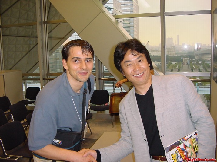 Aber auch Eternal Darkness bot neues. Neue Locations und vor allem neue Charaktere. 12 sollen es ja sein. Gerade der weibliche Part mit der Punpgun hat schon was. Vor allem weil bei den Gegnern weiter geklotzt wurde. Resident Evil darf sich warm anziehen. Ebenfalls testen konnte man die E-Cards für den Pokemon E-Card Reader, von denen eine von uns verlost wird. Auch was seltenes würde ich sagen. Ebenfalls gestürmt wurde neben dem Stand mit den PR Kits der Getränkestand wo man sich bedienen konnte. Bei dem Flüssigkeitsverbrauch in dieser Schwüle auch mehr als willkommen. Beim Rundgang der Spielstationen auch viele posierende und wunderhübsche Japanerinnen, bei denen einem erst im zweiten Hinschauen auffiel das sie auch einen GameCube trugen. Ja ja die Kerle. :-) Viele kleine Small Talks hier und da und es wurde Zeit für den letzten Event an diesem Tag, das Interview mit Shigeru Miyamoto. In einem kleinen Raum mit vielleicht 20 Mann und 2 Fernsehteams stellte sich der Meister den zahlreichen Fragen, wobei die erste sich logischerweise um Zelda drehte. Viel wollte er dazu immer wieder lächelnd nicht sagen. Man sei voll im Plan und solle das fertige Produkt abwarten. Aber zu dem Thema denke ich wurde momentan genug geschrieben. Interessant waren Antworten zu den Onlineplänen Nintendo’s. Man ist nach wie vor sehr skeptisch was vor allem den Profit dieses Marktes angeht. Das man in den Startlöchern steht und entsprechende Produkte haben würde wurde zwar klar gestellt. Aber ein Killer Feature ist dies für Nintendo noch nicht. Was auch den Frühjahrstermin für die Onlineaspekte des Cube in Japan unterstreicht. Auf die Frage wann Mario und Luigi wieder zusammen in einem Spiel an’s Werk gehen verwies er ebenfalls schmunzelnd zum einen auf Smash Bros. DX und auch auf Luigi’s Mansion an dessen Ende auch Mario eine Rolle spielen wird. Wir dürfen gespannt sein. Das Shigeru Miyamoto alles irgendwie locker nimmt zeigte er immer wieder dann wenn sein Dolmetscher die Antworten auf englisch übersetzte. Denn wie immer versteht er die englischen Fragen, antwortet aber auf japanisch. In diesem Momenten feixte er in jede Kamera und zeigte sein sonniges Gemüt. Ja ja, irgendwo sind wir ja alle Kinder geblieben. Natürlich alles dezent, aber nicht ohne Folgen bei den Gästen. :-) Weiterhin war zu erfahren das Nintendo mindestens 7 Spiele aktuell in der Entwicklung hat von denen wir nichts oder nur Gerüchteweise wissen. Weiterhin war das Thema Metroid Prime ein wichtiges. Gerade nach dem Hickhack bei den Retro Studios. Shigeru Miyamoto sagte dann auch das vieles in den Augen Nintendo’s nicht gut genug war in der Vergangenheit und man sich seit einiger Zeit sehr oft in die Entwicklung “einmischt“ |