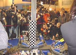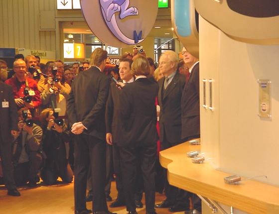Man braucht nicht lange zu suchen in Halle 8. Nintendo überragte mal wieder alles. Was auch daran lag das Sony und Sega als große Aussteller fehlten. Sega sagte sogar erst 2 Tage vorher ab. Die Gründe sind ja nun hinlänglich bekannt. Also erstmal einen ersten Rundgang gemacht um zu schauen wer so da ist und wie sich die Firmen präsentieren. Wie schon erwähnt war auch Nintendo von der Größe des Standes der Big Player und nahm 1/4 der gesamten Halle ein. Gleich am Anfang konnte man an verschiedenen Stationen N64 Games zocken und an einem original Lizensbike aus Excitebike den King markieren. Bei einer kurzen Party Banjo Tooie mußte ich an die denken die in diesem Moment wohl auch gern an dieser Station gezockt hätten. Also erstmal weiter. Als nächste gab es einen Merchandising Stand von Hasbro zu sehen, den wohl jeder Pokemon Fan gestürmt hätte. Fanartikel wohin das Auge reicht. Die Sammelkartenabteilung hatte allein schon einen großen Teil eingenommen. Die erste Runde durch die Halle führte uns an bekannten Firmen wie Take2, Infogrames, Blaze, Vidis, Guillemot oder Lego Media vorbei. Nicht zu übersehen war aber die Attraktion der Halle. Der GBA Stand. Vor allem weil dort 4 Karts standen über die man 4 GBA geschalten hatte und man Mario Kart zu viert spielen konnte. Lange Zeit zum herumlaufen hatten wir aber dann garnicht. Rege Geschäftigkeit am Nintendo Stand, Absperrung der GBA Sektion und eine zunehmende Zahl an Fernsehteams und Reportern versammelte sich um diesen Bereich. Was war hier los? Überraschung, der Bundeskanzler tauchte plötzlich auf, zusammen mit dem bayrischen Ministerpräsidenten und weiteren Politikern. Man kam sich vor wie auf eine Modenschau. Blitzlichtgewitter, Drängelei und hektisches filmen bestimmten die nächsten Minuten. Nintendo's Obrigkeit führte den GBA dem Bundeskanzler vor, der diesen dann auch hielt und sagte das seine Tochter ein Pokemon Fan ist. Was für eine Werbung. Das Bild ging ja durch alle Zeitschriften. Das angebot mal in's Kart zu steigen lehnte er aber wie Herr Stoiber dankend ab. Dafür war sich Bayerns Innenminister nicht zu schade im Kart Platz zu nehmen und eine kurze Einführung in Mario Kart Advance zu bekommen. Ein lustiges Bild. Aber ein wirklich gelungener auftritt. Wenn man bedenkt das diese ganze Meute nur bei Nintendo und Lego war. So schnell er da war, war er auch wieder weg und mitsamt der ganzen Reporterschar. Die Absperrungen wurden wieder weggenommen und endlich der erste Kontakt nach Japan im August. Nur das man diesmal keine 30 Minuten anstehen mußte um 5 Minuten zu spielen. Auch ein Vorteil der Spielwarenmesse. Man konnte sich auch Zeit lassen. |