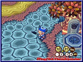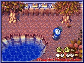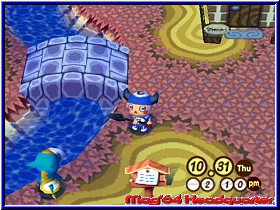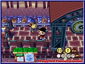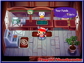 Erst nach einiger Zeit werdet Ihr aus seinen Diensten entlassen. Immer noch genug Schulden geht das Spiel eigentlich jetzt erst richtig los und es beginnt die Geldscheffelei. Zentrale für alle Aktionen des Spielers ist das Inventury Menu. Zu diesem Zeitpunkt wichtig ist der große Mittelteil, der alle Items und Inventargegenstände auflistet und speichert. Alles was man bekommt, findet oder kauft landet als Symbol hier drin. Desweiteren steht hier euer Name, das Aussehen und die Heimatstadt. Sowie das aktuelle Geld das Ihr besitzt. Innerhalb des Spiels entwickelt sich die Umgebung, die Bewohner und das ganze drumherum dynamisch. Die Stadt wächst, Bewohner kommen dazu und die Charaktere erweitern ihre Häuser. Die Stadt an sich ist nicht riesig groß, läßt aber genug Freiräume für Erkundungen. Mit der Zeit weiß man aber wo was ist. Später im Spiel bekommt man auch eine Karte der Stadt und kann so schauen wer wo vielleicht neu hergezogen ist. Neben dem Bahnhof, der später noch wichtiger wird gibt es reichlich Flora und Fauna sowie einen Zugang zum Meer und neben den Wohnhäusern andere wichtige Gebäude. Die Bewohner bieten allesamt Gespräche an, welche euch als Spieler später allerlei Aufträge antragen, die meist aus bringen oder holen von Gegenständen bestehen. Desweiteren erhaltet Ihr hier immer wieder spielerische Tipps, die im Game irgendwann mal eine Rolle spielen können. Doch wie sieht nun ein normaler Tagesablauf aus und wie wird Geld verdient? Da Ihr zu Beginn auch kein Werkzeug und ähnliches besitzt betätigt man sich als Sammler. So kann man an bestimmten Bäumen Früchte finden oder am Strand angespülte Muscheln und ähnliches. Alles was in diesem Spiel nicht Niet und Nagelfest ist kann man bei Nook verkaufen. Im Gegenzug bietet der Shop natürlich reichlich Inventar und vieles anderes das Ihr auch kaufen könnt wenn Ihr das nötige Kleingeld habt. Im Normalfall will Nook 1000 Bell pro Woche Rückzahlung, was euch reichlich Spielraum läßt. Denn 1000 Bells kann man auch mit richtigen Muscheln mit einmal am Strand finden. Das erste Haus kostet euch so knappe 18.000 Bells, die es zu bezahlen gilt. Im Inventury Menu könnt Ihr so 15 Gegenstände transportieren. Dabei könnt Ihr eines speziell auswählen oder auch mehrere markieren und danach wie überall auf solchen Bildschirmen Befehle anklicken. So z.b. alles in der Gegend ablegen um Platz zu schaffen oder um eben gleich mehrere Dinge mit einmal zu verkaufen. Hat man sich ein wenig Geld erspielt kann man ganz langsam in die Tiefen des Spiels eintauchen. Größter Schritt am Anfang ist der Kauf einer einfachen Schaufel.