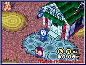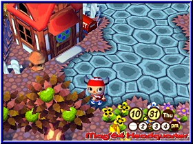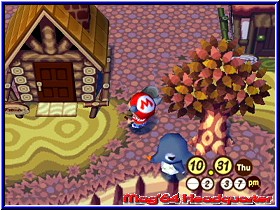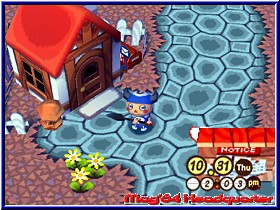 Unter der kindlichen Präsentation steckt in gewisser Weise eine kleine Wirtschaftssimulation die Anleihen von Harvest Moon oder den Sims beinhaltet. Beginnt man das Spiel so erwartet den Spieler hier keinerlei Hauptmenu und ähnliches. Weder Optionen oder Spielmodis und dergleichen werden präsentiert. Einzig ein Charakter aus dem Spiel begrüßt euch, der euch in euer neues Leben bringt. Hier werdet Ihr zunächst nach dem Ziel der Reise und eurem Namen gefragt. Alles könnt Ihr in reale Namen tauchen, so das auch bei uns Leipzig und Berchtesgaden als die Heimatstädte der Redakteure enthalten sind. Lustig wird das allemal im Spiel. Aber das werdet Ihr noch merken. Da Ihr kein Geld besitzt und nicht wißt wo Ihr eigentlich unterkommen sollt telefoniert der Charakter im Zug mit einer Person in der kommenden Stadt. Nach ein wenig Small Talk steigt Ihr aus dem Zug und betretet den Boden eurer zukünftigen Heimatstadt. Und schon beginnt der Kreislauf. Ihr werdet von der angerufenen Person empfangen, der kein geringerer als der Shop Besitzer Nook ist. Er hat auf allem was hier mit Geld, das in diesem Spiel Bells heißt zu tun. Es bietet euch nun eines von 4 äußerst dürftigen kleinen Häusern an. Was auch bedeutet das innerhalb einer Stadt 4 Personen leben können, was den menschlichen Part angeht. Natürlich kostet ein Haus etwas, so auch hier. Allerdings ist man von der Bezahlung noch weit entfernt. Also macht man gleich zum Anfang des Spiels seine ersten Schulden und darf dem guten Nook in seinem Laden zur Hand gehen. Wenn ich in diesem Spiel überhaupt ein Ziel nennen will dann ist es sicher die Entwicklung des eigenen Heims. Immer größere Häuser und immer mehr edleres Ambiente darin und drumherum. So erlebt der Spieler auch gleich zu Beginn wie alles in dieser Stadt zusammenhängt. Neben eurer Person leben auch viele weitere Charaktere in der Stadt, die alle vom Äußeren her eher an die Tierwelt angelehnt sind als an Menschen. Aber dafür ist es ja auch ein Spiel. Zu Beginn sind eure Aktionsmöglichkeiten eingeschränkt. Ihr müßt erstmal für Nook einiges an Arbeiten erledigen um einen kleinen Teil der Schulden abzubauen. Immer euer Begleiter im gesamten Spiel ist die Uhr. Rechts unten wie schon erwähnt in Echtzeit ablaufend. Dabei bietet das Spiel auch die Veränderung der Umgebung was Lichtverhältnisse und Wetter angeht, wobei ich z.b. den Schnee noch nicht gesehen habe. Aber das ist wieder ein Thema der Zeitvorstellung der GCN Uhr. Alle anderen Bewohner der Stadt kennen sich, und so erledigt Ihr bestimmte Lieferaufträge für Nook. |