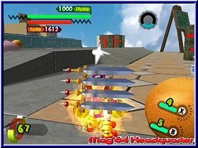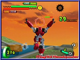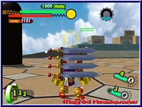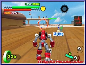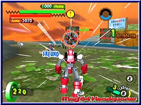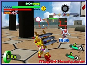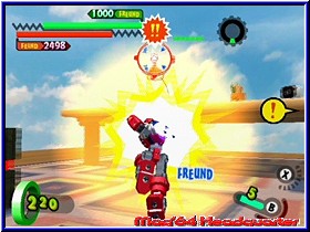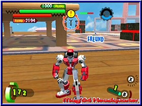 Er kann dazu auch noch reden und gibt seinem neuen Besitzer zu erkennen das er auf diesen Planeten gekommen ist um die Todesmacht zu finden und zu besiegen. Gleichzeitig sieht man wie viele andere kleine Borgs überall niedergehen und so ziemlich jedes Kind seinen eigenen findet. Was anfänglich wie ein Spaß aussieht nimmt nun sein kämpferisches Unheil. Denn anfänglich ist es ein Spaß für die Kinder der Stadt die kleinen Gotcha Borgs gegeneinander kämpfen zu lassen.... Danach landet Ihr im Zentrum des Spiels, einer Stadtkarte die von verschiedenen Anzeigen umrandet ist. Neben dem Gesicht eures Helden findet man hier auf der Karte diverse Anzeigen und Gebietseinteilungen, sowie oben rechts die sehr wichtige GF-Energie auf die ich gleich noch näher eingehe. Zu Beginn werdet Ihr ohne viel Erklärung in ein erstes Gefecht gelassen und das Gameplay zeigt dem Spieler sehr schnell wo es hier lang geht und wie es von nun an immer sein wird. Denn immer dort wo auf der Karte Gesichter oder Ausrufezeichen zu sehen sind kann der Spieler hinwechseln und ein Kampf steht an. Ihr macht sozusagen einen Teil der Stadt so feindfrei. Das ganze immer und immer wieder im Spiel, das durchzogen ist von einzelnen Episoden. Dabei beginnt alles wie schon erwähnt mit Kämpfen gegen eure Freunde in der Stadt und endet im aufeinandertreffen der Gotcha Borgs mit den Robotern der Todesmacht. Anfänglich besitzt Ihr gerade mal einen Borg, den Ihr gefunden habt. So geht Ihr auch in den ersten Kampf. Euch wird das Kampfareal angezeigt und die Stellung der ersten Gegner. Dabei ist dieses Areal vergleichbar mit einer Multiplayer Karte in einem Shooter. Abgegrenzt und durch verschiedene Höhenunterschiede, Deckungsmöglichkeiten und anderes ausgestaltet. Landet Ihr in einem Areal seht Ihr euren Charakter aus der Third Person Perspektive wie im gesamten Spiel. Beginnt der Kampf ist es nun das Ziel die gegnerischen Borgs und Roboter auszuschalten und schlußendlich als Sieger dazustehen. Also kein taktisches Geplänkel wird getreu dem Motto -der Stärkere gewinnt- gespielt. Dabei unterstützen euch zunächst verschiedene Bildschirmanzeigen. Unten links erscheint die Lebensenergie eures Borgs, während die obere dunkle Leiste die Energie der Gegner darstellt. Fast immer in der Übermacht ist auch deren HP Anzeige immer um einiges höher als eure. Um die Gegner zu besiegen habt Ihr nun verschiedene Möglichkeiten. Zunächst bewegt Ihr den Borg per 3D-Stick durch die Gegend und könnt per A-Taste in die Lüfte steigen. Per L,R und Z könnt Ihr das immer aktive Fadenkreuz zwischen den einzelnen Gegnern hin und herschalten. Im Falle des erste Borgs gibt es 2 Angriffs Varianten. Per B-Taste könnt Ihr Geschosse abfeuern.