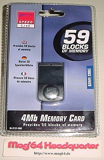 Die über InterAct vertriebene Marke SpeedLink erfreut GameCube Spieler seit einigen Tagen mit 3 neuen Produkten. Memory Cards in 3 verschiedenen Größen aus einer baulich gleichen Serie. Neben der kleinen getesteten 59er Karte eine 123er MC für 29,99 Euro und eine 251er für 39,99 Euro. Letztgenannte also die Größe die Nintendo gerade in Japan auf den Markt brachte. Die Karten baulich in der langen Form gehalten, passen also nicht in eine Spielpackung und deren Vorrichtung. Die Karten sind recht griffig, da sie über eine kleine Wölbung an der Griffseite verfügen. Technisch gibt es auch bei dieser Karte im Testzeitraum nichts zu Klagen. Sie speichert PAL Savegames und US NTSC Savegames nebeneinander. Kopieren - Löschen - Speichern Aktionen macht sie ohne zu murren. Auch ist sie eine der Karten die vor der Erstbenutzung nicht formatiert werden muß. Positiv ist zumindest der Preis der kleinen Karte. Sie ist hier die momentan billigste auf dem Markt. Was die beiden größeren angeht bleibt weiterhin die bigben 16MX ohne Konkurrenz. | ![]()
