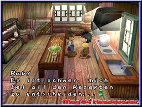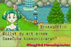 Zunächst gilt es einmal die Verbindung zwischen beiden Systemen herzustellen. Schon hier ist ein wenig Suchen und Probieren nötig. Als erstes schlummern also beide Spiele in den jeweiligen System und der GBA hängt am GCN Slot 2. Danach schaltet man seinen GBA ein und bewegt sich in der GBA Welt mit einem Krug Milch oder etwas anderem zur heißen Quelle und stellt sich zunächst rechts dort an den kleinen See wo die beiden Damen morgens zu finden sind. Nun schaltet man zunächst den Gamecube ein und läuft oder reitet aus der Farm heraus über die Brücke nach links. Dort sieht man einen Weg nach oben auf den Berg. Weiter geht's auf dem GBA. Jetzt wirft man z.b. die Milch in den See und es zeigt sich plötzlich die Erntegöttin, die euch fragt ob Ihr das Spiel mit einem Gamecube verbinden wollt. Wichtig zu wissen das es nur ein Pärchen geben darf. Habt Ihr einmal Daten zwischen 2 Spielständen ausgetauscht auf dem GBA und dem GCN dann kann man z.b. auf einem neuen Spielstand auf dem GCN dies nicht mehr tun. Bis zur Abfrage Verbinden drückt man sich auf dem GBA durch die Menus und wechselt wieder zurück zum GCN. Dort geht man nun einfach in den Eingang zum Berg und wird abrupt gestoppt und die 3 Erntewichtel zeichen sich. Nur wenn Ihr die Erntegöttin on Air habt klappt der Link. Auch auf dem GCN gehen ein paar Abfragen über den Screen und die Datenübertragung beginnt. Soweit so gut. Nur wird der Spieler in diesem Moment im unklaren gelassen was überhaupt passiert ist, da keine entsprechenden Meldungen erscheinen. Auf dem GBA gibt es zumindest einen Anhaltspunkt in Form ener Verbindungsstärke die aus einer hohen Anzahl an Sternen besteht. Je nachdem was Ihr erspielt und erreicht habt füllen sich diese Anzeigen und man kann immer wieder auf's neue linken und nicht nur einmal. Doch was bringt das ganze nun? Dazu muß man auf dem GCN wieder einiges an Vorarbeit verrichten. Wichtig sind hier die Charaktere Van und Ruby im Gasthof. Beide muß man im Verlauf des Spiels mit Essen beschenken. Van ißt kurioserweise sehr gerne befruchtete Eier, während Ruby auf Ziegenmilch steht. Wie auf dem GBA mit den Wichteln müßt Ihr euch diese beiden Charaktere zu Freunden machen. Das dauert eine ganze Weile. Bringen tut es in den beiden Fällen aber im Vergleich eher wenig. So könnt Ihr ab einem bestimmten Zeitpunkt bei Van 10 neue Songs kaufen, die Ihr auf eurem Plattenspieler als Hintergrund Melodien laufen lassen könnt. Fans der alten Harvest Moon Spiele dürfen sich auf Melodien aus diesen Spielen freuen. Ruby hingegen rückt mit der Zeit mit 10 verschiedenen neuen Rezepten heraus, die Ihr in der Küche selber herstellen könnt. Den dritten Part, nämlich das Events aus Mineral Town auch in A Wonderful Life passieren habe ich selber noch nicht erlebt. Aber dazu fehlen mir auch noch ein paar Sterne. Auch wenn das ganze sicherlich nicht schlecht gemacht ist hätte ich mir persönlich eine Datenübertragung der eigenen Ergebnisse gewünscht. So das man man Tiere, Geld oder Ausrüstungen von einer Version zur anderen transferieren könnte. Ich denke so hätte man potentielle Käufer eher überreden können. So ist das Link Feature eher was für die ausdauernden Spieler, die wirklich alles in den Spielen erreichen wollen. | ![]()