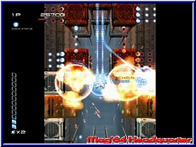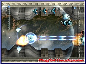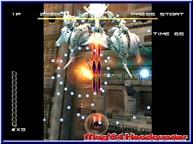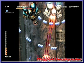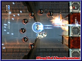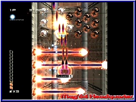 Hier findet man je nach Spieldauer z.b. Artworks zum Spiel die Zeichnungen der Charaktere oder anderen Dingen zeigen. Schön das euch zumindest angezeigt wie lange man spielen muß oder welchen Modus man schaffen muß um hier die Secrets zu aktivieren. Für einen ersten Kontakt mit dem Spiel sollte man den Practice Mode nutzen und muß sehr schnell erkennen das in der Tat ein ungewöhnliches Spiel vor einem liegt. Kern des Spiels ist es mit dem Kampfflugzeug im Screen von unten nach oben oder von links nach rechts Unmengen an Gegnern zu eliminieren und möglichst nicht getroffen zu werden. Kommen wir gleich zum Thema Bildschirm. Es gibt in der horizontalen Darstellung 3 verschiedene Varianten. Allen gemein ist die Tatsache das hier nicht im Vollbild gespielt wird. Maximal 80% des Bildschirms werden genutzt und es bleiben links und rechts schwarze Balken übrig. Das ist sehr ungewöhnlich und eher ein Tribut an die Automaten der alten Zeit. Vorteil ist die Tatsache das die Wege die man mit dem Flugzeug nach links und rechts zu gehen hat gering sind und die Action auf engem Raum vonstatten geht. Kurios das es aber trotzdem im Vollbildschirm geht. Denn in der vertikalen Einstellung fliegt man nun a la R-Type oder Gradius von links nach rechts ohne das Balken oben und unten erscheinen. Etwas gewöhnungsbedürftig das die Bildschirm Anzeigen nicht mitgehen sondern in der horizontalen Einstellung bleiben. Hintergrund ist die Tatsache das Treasure diesen Modus für spezielle Fernsehgeräte konzipiert hat, die das Drehen des Bildschirms erlauben. Was in der PC Branche auch bei uns vorhanden ist dürfte im TV Sektor eher die Ausnahme sein. Ich persönlich konnte mich bis zuletzt nicht 100%ig mit der horizontalen Darstellung anfreunden. Man erwartet doch irgendwie einen Vollbild Modus. Auf einem großen Fernseher fällt das weniger auf. Auf kleinen Geräten kann es aber auch störend sein. Für altes Spielhallen Feeling sicher ideal. Hier muß der Spieler entscheiden ob ihm das zusagt oder nicht. So eingestimmt kann seine ersten Minuten im Spiel angehen. Sobald der Spieler sein Flugzeug steuern kann gilt es per 3D-Stick dieses zu steuern. Natürlich könnt Ihr euch nach allen Richtungen bewegen. Per B Taste bedient der Spieler seine Primärwaffe, die zum einen Unendlich Munition bietet und zum anderen bei gedrückter Taste eine Dauerfeuerfunktion. In einem nach oben scrollenden Bildschirm kommen euch nun die unterschiedlichsten Gegner entgegen. Verschiedene Formen und Größen wissen hier zu gefallen. Ein geniales Feature unterstützt nun den Spieler von Beginn an und sorgt vor allem bei Highscore Puristen für einen lange nicht gespielten Effekt. In der Grundvariante bekommt man natürlich für jeden abgeschossenen Gegner Punkte. |