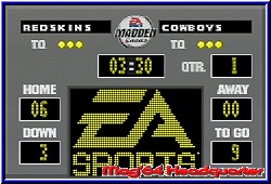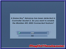 Zunächst sollte der GBA vor dem GCN eingeschaltet sein. Ist dies der Fall erwartet den Spieler eine Meldung und Abfrage ob man das GBA Feature nutzen möchte. Danach kann man auf dem GCN erstmal in Ruhe seinen Spielmodi suchen. Der GBA tritt erst in einem Spiel selber in Aktion. Spielt man ein Meisterschaftsspiel allein dient der GBA zum einen als Anzeigetafel und als Live Ticker. Ist das Spiel gestartet erscheint zunächst die Anzeigetafel mit allen relevanten Daten. In welchem Quarter man sich befindet, wieviele Versuche für das First Down man hat und natürlich der Punktestand. Man spielt auf dem GCN normal sein Spiel, während der GBA dies natürlich überwacht und die Zeit logischerweise mitläuft. Der GBA tritt bei verschiedenen Ereignissen in Aktion. Als erstes wenn ein Spieler verletzt ist. Dem Spieler wird dies angezeigt und mitgeteilt. Dazu natürlich bei wichtigen Dingen. Schafft man ein First Down legt der GBA Screen los. Wie auf den Anzeigetafeln in der Realität werden kleinen Effekte abgespielt, was am Ende im Tanz einer GBA Cheerleaderin endet. Genauso wenn der Spieler einen Touchdown schafft. Im Endeffekt nichts was nun sofort den Kauf eines GBA samt Kabels rechtfertigt. Trotzdem zeigt es endlich mal auch den passiven Anzeige Effekt, den man mit dem GBA erreichen kann und was schon seit der Spaceworld 2001 angekündigt wurde. Ein nettes Feature. Mehr allerdings nicht. | ![]()