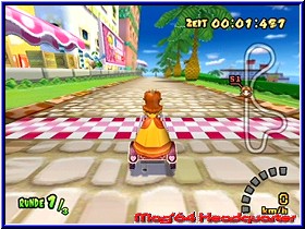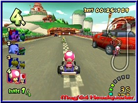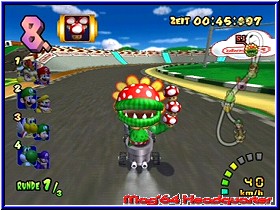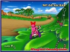 Die Optionen erlauben euch neben Einstellungen für Sound und Rumbler die Aktivierung eines Ghosts für den Time Trial, von denen Ihr auch 2 verschiedene auf der Memcard sichern könnt. Dazu kommt eine Einstellung für die Items im Versus Modus, deren Auswahl Ihr hier einstellen könnt. Als letztes könnt Ihr die Rundenzahl von 1-9 festlegen, sofern Ihr im Versus gegeneinander fahren möchtet. Habt Ihr euch hier ausgetobt kann man sich an die reinen Inhalte machen. Dabei hat Nintendo alles Inhalte so verpackt das man zunächst die Anzahl der Spieler wählt und dann die Modis die man fahren kann. 1-4 Spieler können an einem Gerät loslegen und so überrascht es nicht das im Single Player weniger Modi anwählbar sind als in den Multiplayer Varianten. Für den Anfang starten wir aber im Single Player. Auf dem dortigen Spielmenu bekommt Ihr nun einzig die Möglichkeit die Meisterschaften zu fahren oder im Time Trial nach Bestzeiten zu streben, die natürlich alle gespeichert werden. Was dem Spiel schon hier gut zu Gesicht steht ist der Meisterschafts Modus auch für 2 Spieler. Ihr könnt also an einem Gerät per Splitscreen alles fahren was allein auch geht. Wählt man allein die Meisterschaften an entdeckt der Mario Kart Spieler viele Parallelen zum Vorgänger als auch einiges an neuen Dingen. Neu dürfte wohl das Feature sein das in Double Dash wie der Name schon sagt 2 Fahrer pro Kart auf die Strecke gehen. Dabei ist einer für das Fahren zuständig, während der 2. auf dem Heck herumlümmelt und die eingesammelten Items verteilt. Das geht dann soweit das auf dem Fahrerscreen, der zunächst erscheint immer 2 Charaktere gewählt werden müssen. Dabei sind alle Charaktere in 3 Klassen eingeteilt was Ihr Gewicht angeht. Jeder hat eigene Stats und beeinflußt so auch die Wahl des Gefährts. Die Zeiten in denen nur mit Karts gefahren wird sind hier nun vorbei. Von 50iger Jahre Schlitten über Röhrengefährte bis zu den abartig farblich gemachten Kinderwagen ist alles dabei. An Fahrern habt Ihr neben bekannten Gesichtern einige neue dabei. Ob nun Waluigi oder Birdo, die man zumindest schonmal irgendwo anders hatte sind z.b. Mutant Tyranha und König Buhu völlig neu als spielbare Charaktere. Einige davon müssen aber erst freigespielt werden, was auch für viele der Karts gilt, die man erspielen kann. Das sich dies lohnen kann merkt man später in Sachen Schwierigkeitsgrad und den immer wieder anderen Fahreigenschaften. Für Tüftler ist das Thema Fahrerduo deswegen ein nicht zu unterschätzendes Feature. Denn nicht nur immer wieder neue Fahreigenschaften zeichnen einen Fahrerwechsel aus, sondern auch verschiedene Special Items auf den Strecken sorgen für Herumprobiererei. Doch dazu gleich mehr. |