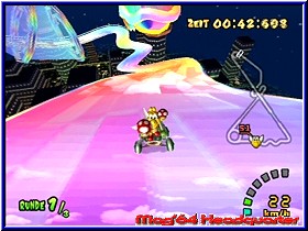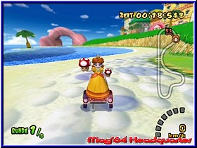 Oder Bowser der einen überdimensionalen Stachelpanzer abschießen kann, der schonmal breiter als die Fahrbahn sein kann. Oder die beiden Baby Varianten von Mario und Luigi, die einen Kettenhund loslassen und leicht schneller als die anderen alles niedermäht was vor ihm auftaucht. Es dauert eine Weile ehe man wirklich mal alle gesehen hat. Aber ich muß zugeben mit persönlich gefallen alle, auch wenn ich oft negativ Bekanntschaft damit machen mußte. Das ist vielleicht auch die größte Stärke des Single Players. Was in der 50er und 100er Klasse noch relativ schnell machbar ist in Sachen Goldpokale wird ab 150ccm durchaus zum Problem. Die gegnerischen Fahrer legen eine dermaßen hohe Aggressivität an den Tag, das man sich manchmal fragt wie man hier was reißen solle. Vor allem in den jeweils letzten Runden können die Gegner einem tüchtig die Suppe versalzen und man landet auf einem der hinteren Plätze, auch wenn man zu Beginn der letzten Runde geführt hat. Man könnte meinen alle auf einen ist jetzt angesagt. Ich persönlich bin davon sehr angetan und habe auch bei diversen Multiplayer Gefechten nichts anderes gehört. Es hebt den Anspruch und ist in meinen Augen einfach typisch für ein Mario Kart Spiel. Ich sage hier lieber schwerer als leichter. Gerade ab dem 150er. Dagegen muß ich zugeben war MK64 ein Witz. Und selbst wenn man 3 Rennen göttlich fährt. Wie oft vergeigt man das letzte und fährt eben doch nur Silber ein. Wenn ich daran denke, wie oft bin ich hinter einem Gegner hergefahren und man sieht nun was er aus seiner Schatulle auspackt und sage mir noch " Laß die Banane fallen und es knallt", um einen Moment später drehend an der Bande zu stehen. ;-) Gerade nach solchen Rennen spürt man aber ob das ganze einfach nur frustet oder aber motiviert. Und bisher war mein oder unsere Spruch immer "Aber jetzt.....!". Es immer und immer wieder zu beginnen spricht für das Spiel. Belohnt wird man in meinen Augen mit der Meisterschaft, die ebenfalls zu zweit spielbar ist. Alle Rennen nacheinander wo am Ende die Punkte aus 16 Rennen zusammengezählt werden um den Sieger zu ermitteln. Wie oft gings in der 150er auch hier schief, bis endlich auch hier Gold in der Vitrine stand. Danach kommt wie nicht anders erwartet der Spiegel Modus und das ganze beginnt von vorn. Natürlich ist man irgendwann durch und der Single Player ist an sich geschafft. Deswegen das Spiel beiseite legen tut hier zumindest niemand. Die unaufhörliche Action ist für mich einer der größten Pluspunkte im Spiel. Um jeden Platz kämpfen und dabei auch mal unfair Pech haben gehört einfach zu einem Mario Kart Spiel. Dem zugute kommen auch die Streckendesigns. Ebenfalls vergleichbar was ihre Länge angeht mit MK64 bieten sie so ziemlich jeden Untergrund und Streckencharakteristik.