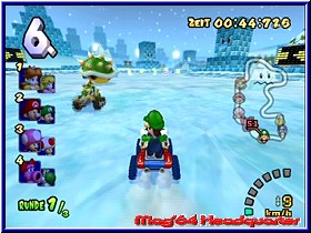 Denn sowohl eine träge und schwammige Steuerung ist dabei wie schnelle und direkte Varianten. Allerdings ist beides geplant und erfordert ebenfalls ein wenig herumprobieren. Auch bei mir war das nicht anders. Anfänglich mit Mario und Koopa unterwegs waren und sind nach deren Freispielen Toad & Toadette meine Favoriten. Soweit sind wir nun schon das wir Toad wählen.;-)) Ja ja die Zeiten ändern sich. Wie gewohnt gebt Ihr mit A Gas und könnt per B-Taste bremsen. Nur benutzt man die mal wieder kaum. Wesentlich wichtiger ist der erneute Einsatz des berühmten Drifts. Da man das Sprungfeature herausgenommen hat mit dem früher der Drift eingeläutet wurde ist dieser ein meinen Augen in Double Dash leichter geworden. Wieder per R-Taste bringt Ihr das Kart zum Driften und könnt per Stick Bewegungen das ganze wieder richtig aufschaukeln. Mehrere Farbabstufungen und Ihr bekommt bei der höchsten Stufe wieder einen kleinen Boost. Weitere Aktionen hängen nun mit dem neuen Doppel Charakter Feature zusammen. Zunächst sieht man dies schon auf der Strecke. Die berühmten Überraschungskisten die Items enthalten gibt es auch hier und diesmal neben einer einfachen Varianten auch in einer Doppelvariante. Fahrt Ihr da hindurch könnt Ihr per X oder Y Taste wieder die kleine Slot Machine stoppen und habt nun 2 Items im Besitz. Jetzt haben praktisch beide Charaktere ein Item das Ihr nutzen könnt. Auch jetzt gibt es eine Neuerung. Jeder Charakter auf dem Gefährt besitzt praktisch ein Item. Steht hinten z.b. Luigi und Ihr benutzt sein Item bleibt er auch dort stehen. Benutzt Ihr nun das zweite Items das Mario gehört der im Moment fährt tauschen beide die Plätze. Dies geschieht automatisch, kann aber auch gewollt per Z-Taste getan werden. Seht Ihr das der Fahrer ein im Moment besseres Items besitzt so schaltet man um und benutzt es ohne das andere zu verlieren. Ein Feature das man sehr oft nutzt sobald es in die höheren Schwierigkeitsregionen geht. Die Items selber sind wunderbar in ihrer Anwendung und Wirkung und beinhalten neben alten bekannten auch einige neue, die wunderbar integriert sind und ohne Ausnahme sinnvoll sind. Angefangen bei den bekannten grünen und roten Panzern, die man nun auch nach hinten schießen kann sind die die Sterne, der Blitz oder der Führungspanzer. Dieser hat etwas neues. Er fliegt zum führenden und stürzt auf diesen Charakter wie eine Bombe. Wer als zweitplatzierter nun im Wirkungskreis dieser Explosion herumfährt wird nun ebenfalls mit herumgewirbelt. Aber auch in Sachen Items greift das Charakter Prinzip. Jeder Charakter verfügt über ein spezielles Item das nur er oder sie anwenden kann. So können die Koopas z.b. die 3er Varianten an Panzern und Pilzen abfeuern, während die anderen dies nur einfach können. |