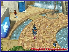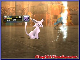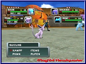 Nur mit diesen beiden "bewaffnet" stürzt Ihr euch in das Abenteuer. Ist die erste Location freigeschaltet besucht man diese und vieles gleicht sich ab jetzt im Ablauf während des gesamten Spiels. Ihr betretet eine Location, untersucht die begehbaren Bereiche, redet mit Leuten und kämpft logischerweise. Dazu gesellt sich gleich in der ersten Location eine weitere Spielfigur, die Ihr zwar nicht steuert, aber dennoch unverzichtbar ist. Wieder ohne Namen wird sie in Kämpfen mehr als wichtig. Parallelen und unverzichtbar in einem Pokemon Spiel sind innerhalb der Locations das Pokemon Center, einer oder mehrere Shops sowie ein Colosseum mit einem örtlichen Leiter. Allerdings ohne die Bedeutung wie in den GB Spielen. Es gibt die üblichen Poke Dollar und auch an Items ist vieles dabei was man vom GB her schon kennt. Ziel ist es aber eben durch Kämpfe der Organisation immer näher zu kommen. Diese Kämpfe das kann ich gleich sagen habt Ihr massenhaft und machen gut 80% der Spielzeit aus. Einfaches Beispiel ist eine simple Straße in einer der Locations. Trefft Ihr auf einen kampfbereiten Trainer so fordert euch dieser zum Kampf und das Pokemon Spielprinzip kommt voll zum Tragen. Nach einem dunklen Bildschirm schwenkt das Bild immer auf einen großen Kampfplatz, in dem von nun an der Kampf abläuft. Neu für ein TV gestütztes Pokemon Spiel dürfte die Tatsache sein, das Ihr im Team kämpft, das heißt immer 2 Pokemon, wie der Gegner auch in den Kampf geführt werden. Dabei baut sich nun euer Held auf und wirft die Pokebälle mit den beiden anfänglichen Pokemon die Ihr besitzt. Der Gegner tut das gleiche und der Bildschirm gleicht nun sehr dem wie in Pokemon Stadium. In den Ecken stehen die Namen der Pokemon, das Level samt der Lebensleiste samt HP Wert. Darunter jeweils eine EP Leiste, die man ja auch hier zunächst genutzt wird. Ziel ist es natürlich den Gegner oder besser gesagt seine Pokemon zu besiegen. Wer zuerst kein kampffähiges mehr besitzt hat verloren. Nun kommen die Crypto Pokemon in's Spiel und ein weiterer großer Unterschied zum sonst bekannten Pokemon Gameplay zeigt sich. Wer davon ausgeht hier überall auf wilde Pokemon zu treffen und diese zu fangen wird enttäuscht. Das gibt es nämlich garnicht. Ohne Fangen geht es aber auch nicht. Also wie genau läuft das ab? Manche der unzähligen Gegner haben unter ihren in den Kampf geführten Pokemon auch ein Crypto dabei. Ihr als Held erkennt aber nicht welche das sind. Dafür ist die zweite Spielfigur da, die euch ein Crypto Pokemon sofort anzeigt wenn ein Trainer es einsetzt. Ziel sollte nun sein dieses zu fangen. Nur die Crypto's sind fangbar in Pokemon Colosseum. Zwar ist das Spiel nicht vorbei wenn Ihr eines mal nicht fangt. Aber je mehr um so besser.
