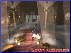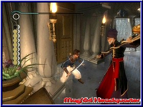Eine geschmeidige "Prinzenrolle" ist ebenso lecker anzusehen, wie das Pendant in der Fernsehwerbung ;-) , die kritischen Wandsprünge sind zwar oftmals ein Grund für den Prinzentod, jedoch klappen diese steuerungstechnisch einwandfrei - habt Ihr den richtigen Zeitpunkt für den Absprung gefunden, kommt Ihr problemlos bis an den obersten Vorsprung, an dem Euer Prinz wieder den notwendigen Halt findet. Mit der "A"-Taste vollführt Euer Alter Ego einen Sprung, ein beherzter Angriff erfolgt nach dem Druck auf die "B"-Taste. Neben dem allgemeinen Angriff habt Ihr die Möglichkeit Eure Kontrahenten mit einer Sprungattacke ("A" und "B") oder aber einer so genannten "Mauer-Abprall-Attacke" außer Gefecht zu setzen (Spezialattacke: "Mega-Frost"). Um Zweitere durchzuführen, lauft Ihr auf eine Wand zu und betätigt im richtigen Zeitpunkt den "A"- sowie "B"-Knopf. Mit einem Satz stößt sich der Prinz mit den Beinen von der Wand ab und attackiert geeignete Feinde, die in einem entsprechenden Radius positioniert sind. Befindet Ihr Euch ab und an in einer scheinbar aussichtslosen Lage, genügt der Druck auf den "R"-Button und schon gelingt es Euch jede feindliche Attacke mit Eurer Waffe gekonnt zu parieren. Sobald ein angreifender Gegner zu Boden geht, könnt Ihr mit der "Y"-Taste dessen Sandmenge aufnehmen, welche Euch wiederum gutgeschrieben wird. Apropos Sand: dieser ist beinahe während des gesamten Spieles von größter Bedeutung, vor allem dann, wenn Ihr die Zeit während des Spieles zurückspulen wollt. Werdet Ihr beispielsweise während des Kampfes unglücklicherweise kritisch getroffen, dürft Ihr - abhängig von der Anzahl Eurer so genannten "Sandbehälter" - durch das Betätigen der "L"-Taste die Zeit bis zu zehn Sekunden zurückdrehen. In vielen Situationen gelingt es Euch somit, einen bereits verlorenen und scheinbar hoffnungslosen Kampf komplett zu wenden und letztendlich siegreich diesen für Euch zu beenden. Ebenso werden verhunzte Sprünge in einen tiefen Abgrund auf Knopfdruck revidiert, ein Tritt in eine schmerzende Stachelfalle kann ohne weiteres korrigiert werden. Einmal die Zeit zurückgedreht, leert sich ein Sandbehälter Eurer Leiste (linker Bildschirmrand). Besiegten Gegnern kann ihr eigener Sand durch einen heldenhaften Dolchstoß gemopst werden; Euch wiederum wird dadurch Eure Sandleiste ein Stückchen gefüllt. Innerhalb der linearen Spielwelt, welche größtenteils im Inneren prächtiger Bauten dargestellt wird, könnt Ihr von Zeit zu Zeit hell-leuchtende Sandwolken erkennen, die der Prinz mit seiner Waffe aufnehmen kann. Acht solcher Wolken erweitern Eure Sandbehälter-Leiste dauerhaft um einen weiteren Container. Des Weiteren ist der elegante Athlet im Besitz von Energie-Behältern, welche den Zweck haben, die Zeit zu verlangsamen oder aber diese anzuhalten.