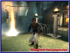 Kein Schimmer grafischer Ungereimtheiten, kleinere Patzer wie seltene, jedoch ungünstige Kameraperspektiven, können getrost unter den persischen Seidenteppich gekehrt werden. Mit 15 Speicherblöcken sind auch Besitzer kleinerer MemoryCards gut dabei, zudem habt Ihr insgesamt drei Speicherplätze zur Verfügung auf denen Ihr Eure Spielfortschritte absichern dürft. Nach diversen Entwicklerlogos erwartet uns das Hauptmenü des Spiels, wobei Ihr unter vier Menüpunkten wählen könnt. Um in ein neues Abenteuer einzutauchen, entscheidet Ihr Euch für ein "Neues Spiel", einen alten Spielstand dürft Ihr unter "Spiel laden" fortsetzen. Innerhalb der Optionen habt Ihr die Möglichkeit an diversen Punkten - "Sound", "Anzeigegerät", "Kamera", "Controller", "Sprache" - herumzutüfteln. Neben dem Deutschen können sich Sprachbegabte unter Euch auch für die englische, spanische, italienische sowie französische Sprache entscheiden. Als letzten Menüpunkt erwarten Euch die "Zugaben", die neben den "Credits" auch das Urspiel von "Prince of Persia" aus dem Jahre 1989 bieten. Jedoch müsst Ihr dazu im Besitz der GameBoy Advance-Version sein. Normalerweise findet sich bei Titeln, die die Möglichkeit der Connectivity-Funktion bieten, ein separater Text im Update. Jedoch konnte ich innerhalb des Testzeitraumes das Originalspiel nicht frei spielen, obwohl mein GameBoy Advance eine Verbindung zum Gamecube feststellte. Leider findet man auch in zugehörigen Anleitungen keine Ratschläge, wie man vorgehen sollte, technische Probleme können eigentlich ausgeschlossen werden. Nichtsdestotrotz widmen wir uns nun dem tatsächlichen Spiel, welches sich als reinrassiges Action-Adventure, gespickt mit zahlreichen Sprungpassagen, herausstellen sollte. Neben zahllosen, actionhaltigen Kampfszenen, begibt sich unser Prinz auf waghalsige Kletterpartien, überquert die tiefsten Abgründe, hangelt an brüchigem Mauerwerk und erachtet auch das unmöglichste Objekt geeignet dafür, an diesem herumzuturnen. Fahnenstangen, Seile sowie bröselige Säulen machen da keine Ausnahmen. Weil unser Protagonist ein wahrer Akrobat ist, gelingen ihm die waghalsigsten Manöver mit Leichtigkeit, realistische Bewegungsabläufe und eine Unmenge an verschiedenen akrobatischen Einlagen garantieren einen wahren Augenschmaus. Intuitiv ist vor allem die Steuerung, die den Prinzen mühelos und ohne langwierige Lernprozesse punktgenau durch das Abenteuer führt. Diffizile Sprünge sind ebenso möglich wie halsbrecherische Kletterpartien, Kämpfe lassen sich kinderleicht ausfechten, lediglich das starke Gegneraufkommen erschwert diese zusätzlich.