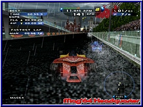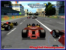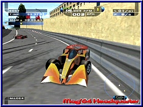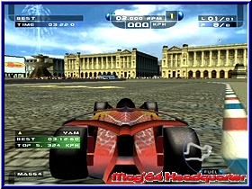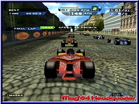 Enge Strecken die zwar viele Randbebauungen bieten. Aber vielfach lieblos hingeklatschte Texturen und Bitmaps, die vor allem viele harte und unrealistisch wirkende Farbübergänge bieten. Da auch reingarnichts animiert ist wirkt die gesamte Grafik sehr steril und teilweise verwaschen. Mit 2 oder 3 Expansion Paks hätte das vielleicht auch ein N64 hinbekommen. ;-) Für einen GCN ist die Grafik unterdurchschnittlich. Am schlimmsten wird das bei Nachtfahrten. Willkommen in der Villa Kunterbunt könnte man meinen. Zwar gut gedacht werden die Streckenbegrenzungen mit flackernden roten und grünen Lichern gezeigt und das ganze wirkt wie auf der Rollbahn eines Flughafens. Das man nach ein paar Minuten die Orientierung verliert ist die Folge davon. Kommt hier noch Regen dazu und die Gischt nimmt die Sicht dürft Ihr euch ein paar Kopfschmerztabletten dazulegen. Hätte das Game nun noch eine problematische Framerate wärs das. Diese ist Gottseidank in Ordnung. Der Gamespeed selber kommt nur auf den Stadtstrecken zum tragen. Hier fühlt man sich bei 300km/h auch so. Auf den ländlichen Strecken wirkt das eher wie 100km/h. Das gleiche beim Sound. Die Motoren klingen nicht wirklich wie Formel Motoren, sondern erinnern eher an eine Turbine. Nun könnte man sagen das zukünftige Boliden mit ihrer Power so klingen könnten. Allerdings würden selbst Mechaniker von heute über maximal 17.000 Umdrehungen lachen, welche die Fahrzeuge bieten. Umgebungen nimmt man kaum wahr und Zuschauergejubel wirkt eher aufgesetzt als motivierend. Der Multiplayer reißt hier auch nichts mehr heraus. Lediglich ein Quick Race und eine Grand Prix ist fahrbar. Dabei maximal 2 Computergegner zu den beiden menschlichen Spielern und das ganze in einem vertikal geteilten Bildschirm. Allerdings nicht unbedingt von Nachteil. GameSpeed und Details der Strecken sind wie im Einzelspieler, was allerdings nicht sonderlich überrascht. Was kann man nun abschließend zu diesem Spiel sagen. Eine Enttäuschung auf dem GCN. Gerade jetzt nach der Pro Rally Geschichte hätte ein Top Rennspiel von Ubi Soft gut getan. Das Spiel schwächelt in vielen Belangen. Keine schöne Grafik, träge und sehr gewöhnungsbedürftige Steuerung und ein teilweise sich kurios auswirkendes Setup. Da helfen auch keine umfangreichen Spielmodis und kleine gelungene Dinge wie das Windschatten Fahren. Vieles paßt hier einfach nicht und erscheint teilweise unlogisch in der Umsetzung. Neben Driven der zweite richtig schlechte Racer auf dem GCN. Wollen wir hoffen das Ubi Soft mit Racing Simulation 3 endlich wieder ein sehr gutes InHouse Produkt abliefert. Speed Challenge kann man einem Rennspielfan in dieser From nicht empfehlen. |