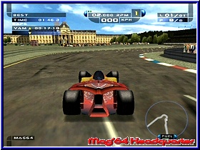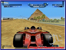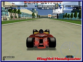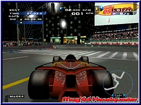Schon auf diesem Bildschirm bekommt man den ersten Eindruck der Pseudo Inhalte. Nämlich die Fahrzeugwahl die euch gerade mal aus 6 verschiedenen Formel Boliden der Zukunft wählen läßt. Futuristisch kann man hier verschiedene Designs pro Fahrzeug wählen. Unterschiede neben dem Aussehen was ihr Fahrverhalten angeht gibt es zunächst nicht. Einzig der Geschmack entscheidet. Hat man sein Fahrzeug gewählt sollte man am besten ein Grand Prix Rennen anwählen um sich mit dem Spiel vertraut zu machen. Wie in allen Spielmodus gibt es auch hier einen Vorberreitungsbildschirm. Viele verschiedene Punkte von der Streckenwahl über die Wahl des Setup Modi bis zum Einstellen der Gegneranzahl reicht die Auswahl. Später sind in den einzelnen Spielmodis nicht alle Punkte verstellbar und teilweise festgeschrieben. Gegen maximal 7 Computergegner fahrt Ihr in den einzelnen Spielmodis, was für ein Formel Spiel eindeutig zu wenig ist. Ebenfalls ist die Anzahl von 11 Strecken im gesamten Spiel nicht das höchste der Gefühle. Desweiteren könnt Ihr hier das Wetter der Strecke wählen, was spielerisch einen Pluspunkt bietet. Neben reinen Schönwetter Rennen kann man neben festen Regenrennen auch sich änderndes Wetter einstellen. Was heißt das z.b. am Anfang eines Rennens die Sonne scheint und ab der Hälfte des Rennens der Regen einsetzt. Dazu kommen Einstellungen für ein Schadensmodell, die Stärke der Computergegner als auch ob Kollisionen möglich sein sollen. Deaktivert man diesen Punkt ist das wie Spielen mit einem Cheat und die Wagen berühren sich nicht und fahren durcheinander durch. Für ein Üben sicherlich ein positiver Punkt. So bietet auch der Grand Prix Modus neben einem Practice das Qualifying und das Rennen, das hier bis zu 30 Runden betragen kann. Bevor man jedoch ein Rennen startet gilt es überall ein Setup zu durchlaufen. Es gibt 4 verschiedene Setup Varianten, die euch die Arbeit abnehmen. Von Easy Set bis zum Pro Modus. Hintergrund ist das je nach technischem Verständnis euch die Arbeit abgenommen wird. Allerdings sollte das Setup sehr unglücklich umgesetzt sein. Zwar bietet es teilweise mehr Einstellmöglichkeiten als z.b. F1 2002 und reicht von Flügeleinstellungen über Bremsverteilung, Federung bis zur Schwerpunkt Verlagerung des Boliden. Doch dazu später mehr. Gehen wir zunächst vom Grundgerüst und einem Easy Set aus. Ist man soweit fertig kann man sich an ein Rennen Wagen. Völlig ungewohnt dürfte Formel Sport Freunden der Start sein. Wie zu Großvaters Zeiten wird nicht hintereinander gestartet, sondern seitlich versetzt. Ungewohnt, aber auch mal was neues. Gefahren werden kann der Wagen aus 4 Viewpoints, welche aber auch grafisch sehr verwaschene Fahrzeug Texturen hervorbringen. |