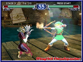 Desweiteren bieten die Optionen die Abteilung -Geschichte der Sammlung-. Nichts anderes als alle erspielten Secrets werden hier aufgelistet und angezeigt, sofern man sie geholt hat. Insgesamt bietet die GCN Version 88 dieser Secrets. 2 mehr als die beiden anderen Version. Grund ist der gute Link, dem gleich mal 4 Bonuskostüme verpaßt wurden und somit 2 mehr bietet als die Bonuscharaktere der anderen Versionen. Der für viele wichtigste Punkte dürfte die Steuerung sein. Neben 3 verschiedenen Setup's darf der Spieler im Modus Frei zumindest alle Action Taste nach Lust und Laune umbelegen. Auch etwas das man viel zu selten findet. Um einen ersten Kontakt mit dem Spiel zu machen bietet sich der Original Modus an. Gleich mal 7 verschiedene Spielmodi bieten sich zum Zocken an. Neben dem Arcade Mode, dem Duell und Team Duell für 2 Spieler sowie die Single Player Modi Zeitangriff, Überlebenskampf und der Teamkampf. Als letztes ein Punkt der nicht nur wie im Lösungsbuch als euer zweites Zuhause angepriesen wird - das Training. Wer das nicht besucht oder vorhat wird mit SCII nicht lange Spaß haben oder es nicht weit bringen. Denn um auch nur Ansatzweise die Möglichkeiten der Steuerung zu erleben muß man sich hier viel Zeit nehmen. Wie in allen anderen Modi auch gilt es zunächst sich für einen Charakter zu entscheiden, was ebenfalls schon eine Wissenschaft werden kann. Hat man keine besonderen Vorlieben wird man nur durch viel Training seinen Favoriten unter den 23 Charakteren finden. Wobei auch hier Anfangs natürlich nicht alle verfügbar sind. Da wir alle patriotisch sind ist der gute Link ein sinnvoller Charakter. ;-) Aber auch weil er sich für den Einsteiger sehr eignet. Ihr wählt dazu einen Gegner und eine der knapp 15 verfügbaren Arenen und ab geht die Post. Man muß nicht lange überlegen was eine Stärke des Spiels darstellen sollte. Hat man sich hier mal kurz alle Arenen angeschaut so zeigt sich SCII von einer noch nicht gesehenen Grafikpracht. Von den edlen Hintergründen, animierten Backgrounds und den großen Charakteren samt ihrer Animationen läßt man sich sofort in den Bann ziehen. Wobei es allein dafür einen speziellen Bonus Modus gibt. Aber dazu wiegesagt später mehr. Ihr habt im Training die Möglichkeit das Agieren des Gegners anzupassen. Ob er nun als Dummie blöd herumstehen soll oder in verschiedenen Variationen agieren soll. Üben unter Wettkampfbedingungen nennt man dies glaube ich. Die Steuerung im Spiel bietet viele Besonderheiten und reichlich Möglichkeiten mehr als das typische "ich brauche eh nur 3 Moves" Gekloppe auszuführen. Zunächst positiv das Ihr sowohl mit dem 3D-Stick als auch dem Steuerkreuz steuern könnt. Überhaupt ist die Pad Wahl hier nicht zu unterschätzen. Wer mit dem Kreuz spielt wird das Original Pad nicht lange nutzen.