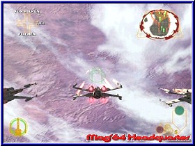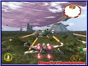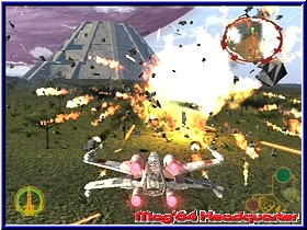 Zu den verfügbaren im Spiel kommen weitere die man freispielen kann wie z.b. den Millenium Falcon. Hier bietet Rebel Strike nicht unbedingt mehr als der Vorgänger. Irgendwo auch anchvollziehbar, da man sich innerhalb der Star Wars Saga nich plötzlich neue Vehicle ausdenken kann. Steht man vor einem Wing kann man den Sprecher dazu bewegen Details über den Wing zu erzählen. Auch ein Pluspunkt im Spiel das sämtliche Stimmen original sind und das Star Wars Flair somit unterstreichen. Wie immer ist auch das komplette Spiel in Sachen Texten und Sprachausgabe komplett eingedeutscht. Qualitativ klingen die Stimmen aber besser als im Vorgänger. Hat man sein Vehicle gewählt verläßt dieser in einer Sequenz den Hangar und das Level beginnt. Jedes Level verfügt meist über ein sehr imposantes Intro, das ebenfalls sprachlich voll unterlegt ist und euch die Mission und die Ziele vorstellt. Drückt man im Level die Starttaste kann man dies auch schriftlich nochmal verfolgen. Beginnt ein Level so seht Ihr das Geschehen immer aus dem demselben Viewpoint zu Beginn. Der Bildschirm selber ist in 4 Hauptanzeigen eingeteilt. Rechts oben findet man das Radar, das gegnerische Ziele und Fighter anzeigt, sowie per Radarstrahl das aktuelle Ziel was die Richtung angeht. Rechts unten ist eure Waffenanzeige, die man jetzt in 2 Teile für die Primär und Sekundärwaffe eingeteilt hat. Hier findet man die Anzahl der Munitition für die Waffen. Beim X-Wing seine Torpedos oder beim Y-Wing z.b. die Proton Bomben. Links unten findet der Spieler die Anzeige für sein aktuelles Schild. Per Draufsicht wird der Wing in einen Farbkreis gehüllt. Von Grün über Gelb bis zu Rot reicht die Anzeige ehe der Wing das zeitliche segnet. Oben links wurde erneut das Steuerkreuz angezeigt, das es euch erlaubt Befehle zu geben. Zumindest in den Missionen in denen Ihr Mitstreiter habt. Dies ist eine Art Kommando Zentrale, welche das Steuerkreuz auf dem Screen abbildet und auch so bedient bedient wird. Ihr könnt also per drücken einer Richtung mitten in der Action euren Begleitern Kommandos geben. In vielen Missionen eine große Hilfe und nicht zu unterschätzen. Vom Feeling in den Missionen was die Luftkämpfe angeht ist alles beim alten geblieben. Man fühlt sich wie im Vorgänger und freut sich über neue Locations und Aufgaben. Es sind dann eher Kleinigkeiten die in diesem Part auffallen. So ist die Sprachausgabe wesentlich häufiger und endet oftmals auch im Small Talk unter den einzelnen Piloten. Die Missionen sind auch hier wieder in mehrere Abschnitte eingeteilt. Das heißt Ihr beginnt mit einem bestimmten Gleiter um im Verlauf der Mission in einen anderen zu wechseln oder gar in die die zweiten große Neuerung neben dem Multiplayer. |