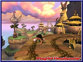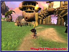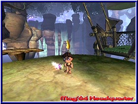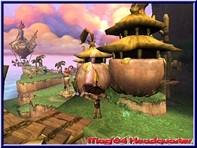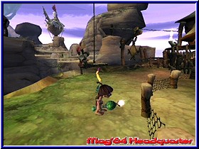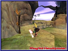Teilweise an den unmöglichsten Stellen, die nur durch präzises Absuchen der Regionen ersichtlich werden. Beispielsweise findet Ihr Yorbels mitten in großer Höhe, allein eine einzelne Liane kann Euch zum Ziel und damit dem Aufsammeln der runden Kugel führen. An anderer Stelle wurden Yorbels in einer finsteren Höhle versteckt, die man aufs Genaueste absuchen sollte um nicht einzelne rundliche Gebilde zurückzulassen. Zur Komplettierung aller Yorbels sollte man einen guten Orientierungssinn mitbringen, denn die gesamte Welt besteht aus einem Guss; nur einige Ladebildschirme machen dem Spieler erkenntlich, dass es in einen neuen Levelabschnitt geht. Mir persönlich gefällt die Aufteilung eines "Super Mario Sunshine" besser: von einem zentralen Ort aus habt Ihr die Möglichkeit alle Levels nacheinander zu betreten. Die Übersichtlichkeit bleibt erhalten. Tak macht es zwar nicht komplett anders - auch dort findet man einen zentralen Ort, das Dorf - dafür grenzen nicht alle Regionen an das Dorf, einige Abschnitte müssen durchquert werden, um andere Passagen überhaupt erreichen zu können. Zugute halten muss man "Tak und die Macht des Juju" aber, dass es zentral gelegene Transporter-Schreine gibt, die Euch zu vielen Stellen der Spielwelt bringen werden. Häufig wird Tak während seines Abenteuers von feindlich gesinnten Kreaturen attackiert, besser bekannt unter dem Begriff der "Nerbils", kleinen Monstern, die Tak ans Leder wollen. Da jene meist aus Brutstätten, die entweder am Boden oder an Bäumen zu finden sind, heraus kommen, gilt es, zuerst diese "Gebärstationen" auszulöschen. Weiterhin attackieren Euch - nach Beschuss mit Eurem Blasrohr - kleine Äffchen, die auf der anderen Seite aber auch recht nützlich sein können. In der Regel feuern die Affen auf die ihnen nächst gelegene Kreatur, gleichgültig ob gutmütig oder feindlich gestimmt. Daher könnt Ihr die "Könige der Baumkronen" auch gut dazu missbrauchen, beispielsweise Schafe, die für Euch ein Laufband antreiben sollen, zu dieser Tat zu motivieren (speziell dann, wenn die lebenden Wollknäuel außerhalb Eurer Reichweite sind!). Zugleich gibt es weitere nützliche Landschaftsbewohner, die Euch tatkräftig zur Seite stehen - Voraussetzung dafür ist der Slogan "gewusst wie". Riesenaffen schleudern Euch mittels einer Palme zu entlegenen Stellen, mit speziellen Früchten, die Ihr von vereinzelten Büschen erhaltet, lockt Ihr diese zu anderen Palmen. Von dort aus seid Ihr nun beispielsweise in der Lage, Euch bis zu diesem Zeitpunkt unbekannte Abschnitte zugänglich zu machen. Auf dem Rücken eines kräftigen Nashorns hingegen sind Absperrungen aller Art kein sonderlich großes Problem mehr, sogar eine Steinsäule kann schon mal zu Fall gebracht werden. Apropos Fall: fällt Tak einmal in die Tiefe - und glaubt mir, das wird häufiger passieren - startet Ihr meistens ein kleines Stück vor Eurer letzten Absturzstelle.