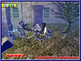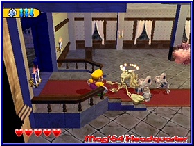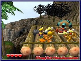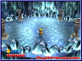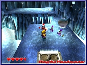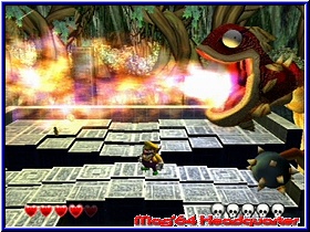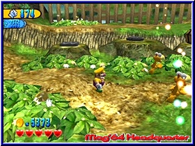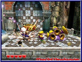 Jetzt bekommt der Spieler die Story anhand einer langen Sequenz nochmal gezeigt. Danach beginnt das eigentliche Spiel, das in einer Art Hauptbereich um die Burg beginnt. Von hier hat Wario Zutritt zu 4 Spielwelten in denen der Bär steppt, sowie den GBA Games und der finalen Schatzkiste um die es eigentlich geht. Zu Beginn des Spiels ist nur die erste Welt anwählbar. Erst wenn der Obermotz besiegt ist darf zur nächsten weitergegangen werden. Betritt Wario eine dieser Welten findet man hier ebenfalls nochmal Verzweigungen in Form 3er Türen. Wieder ist zu Beginn nur eine offen. Im Endeffekt warten so pro Welt 2 Action Level samt Zwischengegner und in der dritten Tür pro Welt der Obermotz die jeweils einen der wichtigen Schlüssel zur Schatzkiste in sich bergen. Also geht Wario in die offene Tür und das reine Spiel beginnt. Gegenüber anderen Jumpern bietet Wario World ein anderes Spielsystem. In einer 2 ½ D Ansicht steuert Ihr Wario in verschiedene Richtungen im Spiel. Links wie rechts mit der Möglichkeit ein wenig in die Tiefe des Screens zu gehen als auch direkt nach vorn oder hinten. Reine 3D Level wie sie ein Mario bietet findet man hier nicht. Vergleichbar mit den alten Bomberman Titeln auf dem N64, die ähnlich aufgebaut waren. In jedem Level ist es das Ziel verschiedene Items und Schätze zu suchen und einzusammeln. Wario World erzeugt gerade diesen Sammeleffekt sehr extrem. Das beginnt z.b. bei 8 kleinen Schätzen die man finden kann. Dazu gilt es für jeden erst einen Schalter zu finden mit dem man eine dazugehörende Kiste überhaupt erstmal aktiviert irgendwo in der Welt um den Schatz zu finden. Nur wenn man alle 8 findet darf man später überhaupt eines der GBA Games nutzen. Weiterhin muß Wario sogenannte Kristalle finden, ohne die man ein Level erst garnicht beenden kann. Dazu kommen kleinen Figuren, die zum einen Wario Tipps geben und zum anderen eben auch ein Spielziel darstellen. Wem das immer noch nicht reicht darf sich auf die Suche nach 8 Goldstatuen machen. Diese dienen wiederum der Erweiterung der Lebensleiste. 4 Herzen bietet das Spiel zu Beginn. Kern des gesamten Gameplays ist aber Wario's Action selber. Denn ein Unmenge an Gegner wird er im Spiel vorfinden, denen er sich erwehren muß. Nun kommt die Steuerung in's Spiel. Per 3D-Stick steuert Ihr die Bewegungen, während die A-Taste dem Sprung dient. In Verbindung mit der R-Taste darf Wario die Stampfattacke nutzen. Ähnlichkeiten zum Hosenmatzsprung eines rotbemützen Klempners sind natürlich rein zufällig. Die B-Taste dient in der Grundvariante dem Punch. |