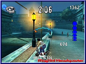 Ein Lob gibt es zu Beginn für den Multiplayer. Zumindest ein Spielmodi sollte auch Vorbild für andere Spiele sein. Denn Whirl Tour bietet einen kompletten Co-op für den Story Modus was es 2 Spielern ermöglicht die Inhalte zusammen zu erspielen. Beginnt man allein gilt es zunächst den Charakter zu wählen und einen entsprechenden Scooter, von denen man im Verlauf ebenfalls mehrere freispielen kann. Danach folgt die Levelauswahl. 8 Level sind im Spiel enthalten, die in sich verschiedene Aufgaben bieten die man lösen muß. Erst ab bestimmten Aufgabengrenzen werden neue Level anwählbar. Postitiv das man dazu nicht beinhart alle Aufgaben pro Level lösen muß. Mat Hoffman 2 läßt grüßen. Man kann sich schwere Dinge also aufheben und kommt trotzdem erstmal im Spiel voran. Beginnt ein Level fühlt man sich an Tony Hawk & Co erinnert. In einem Kameraflug werden euch die Aufgaben in der folgenden Location kurz vorgestellt. Ziel ist es neben dem Erreichen eines Highscores immer mehrere andere Aufgaben zu lösen die mit der Location zu tun haben. Öffne 5 Ventile, stoße eine Statue um oder mache einen speziellen Trick an einer speziellen Stelle. Also alles Dinge die man als Trick Action Gamer schon zur Genüge kennt. Andererseits geht Whirl Tour auch ein paar neue Wege. Zum einen verfügt euer Charakter über eine Energieleiste links oben im Screen. Bei Stürzen und vor allem Gegnereinwirkungen, die es hier gibt füllt sich diese Anzeige rot und das Level ist vorzeitig beendet sollte diese Anzeige voll sein. Was Evolution Skateboarding im Ansatz zeigte ist hier die Regel. Pro Level müßt Ihr unter anderem durch vollführen von Tricks je 2 Bossgegner erledigen um zum einen Schlüssel zu bekommen und zum anderen damit eine Geheimpassage zu öffnen, die es in jedem Level gibt. Was mir nicht gefällt und ich persönlich mittlerweile für antiquiert halte ist das Zeit Feature. Euch stehen pro Turn 3 Minuten zur Verfügung um die Aufgaben anzugehen. Ist die Zeit vorbei beginnt man das Level erneut und muß nicht geschaffte Aufgaben auf's neue angehen. Hier ist mir das Aufgaben Feature ohne Zeitdruck eines Tony Hawk 4 oder BMX XXX lieber, da der Spielfluß mehr erhalten bleibt. Was die Steuerung und die Viewpoints angeht kommt Whirl Tour konventionell daher. Ihr seht euren Charakter auf seinem Scooter aus der Third Person Perspektive und könnt per C-Stick die Kamera jederzeit um ihn drehen sowie diese höher oder niedriger positionieren. Teilweise geht mir die Kamera aber nicht schnell genug mit. Gerade bei abrupten Richtungswechseln oder Tricks in engen Pipes und ähnlichem. Hier hätte sie etwas dynamischer sein müssen. Fahrt Ihr durch weite Areale wo die Kamera Platz hat macht sie dagegen keine Probleme. |