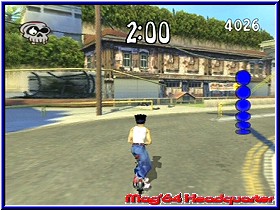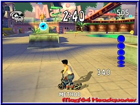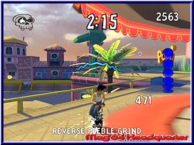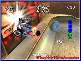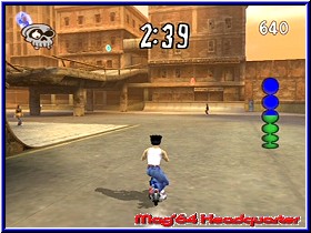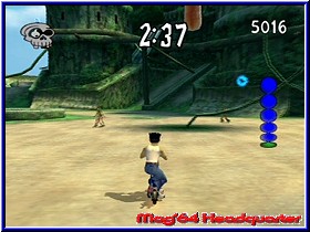 Wer Tony Hawk einmal gespielt hat wird mit dem Spiel sofort warm, da sich die Steuerungen so gut wie garnicht unterscheiden. Der Stick und das Kreuz dient dem Steuern, während die B-Taste dem Sprung gehört. Sehr gelungen ist der Lenkradius, der sehr klein ist und auch Wenden auf engem Raum zuläßt. Auch hier drückt man die Spungtaste um den Charakter ein wenig abzuducken und läßt die Taste dann los wenn man der Meinung ist jetzt muß man springen. In der Luft wartet die gewohnte Trick Action Steuerung. Knapp 80 Moves sind enthalten, die durch Richtungen samt der Action Tasten ausgelöst werden. Es gibt auch hier Kombos samt Multiplikatoren sobald Ihr 2 oder mehr Tricks in der Luft schafft und Grinds sind genauso Normalität wie Manuals am Boden. Die Moves gehen recht zügig von der Hand, sehen aber in der Luft nicht so spektakulär aus. Nicht so viele Animationsphasen sorgen für eine wenig aufregende Trick Action. Hier macht sich auch der fahrbare Untersatz durch den Scooter nicht so gut. Es gibt zwar verschiedene davon, bringen aber den Kick in der Luft, den man von anderen Spielen gewohnt ist nicht so richtig rüber. Was teilweise auch daran liegt das man den GameSpeed hätte höher machen sollen. Trotz 60Hz ist das reine Tempo streckenweise einfach zu langsam. Es funktioniert zwar alles, aber irgendwie etwas träge an vielen Stellen. Man hat immer das Gefühl bei Sprüngen das die geplanten 2 oder 3 Moves niemals klappen werden. Zwar ändert sich dies wenn man im Verlauf neue Scooter freispielt. Allerdings bieten neue Scooter nicht immer neue Speed Möglichkeiten. Im Gegenteil. Manche sind langsamer, bieten aber z.b. mehr Spin Vermögen. Was die Level an sich angeht sind sie eigentlich gelungen, wobei die Größe der Level in Tony Hawk und teilweise auch anderer Spiele nicht erreicht wird. Dafür sind mehr geheime Passagen enthalten als bei anderen Games. So ist durch die Boss Gegner ja eine Aufgabe gerade eine spezielle geheime Passage zu öffnen hinter der man am Ende immer einen Sender findet den man zerstören muß. Diese Aufgabe ist auch in jedem Level enthalten. Gefallen hat mir hier die Belohnung. Denn spielen kann man alle Level auf 3 verschiedene Arten. Normal, was dem reinen Aufgabensystem entspricht sowie als Rennen und als Bonus. Zerstört man also den Sender in einem Level darf man das Level in diesem Rennen Modus anwählen. Eine völlig neue Location wartet auf euch die wie eine Rennstrecke gemacht ist und ein Wettrennen gegen einen neuen Gegner von einem Punkt A nach B bietet. Was hier auffällt ist eine perfekte Framerate. Obwohl Whirl Tour da allgemein keine Probleme bereitet fällt der Wechsel zwischen 3D Arenen und diesen Rennstrecken extrem auf.