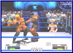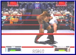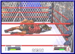 Ist er ein harter Bursche, der einiges einstecken kann und sein Sprungverhalten das bester der WWF ist? All diese dinge liegen in euren Händen. Um das Maß voll zu machen, muß man noch ein paar Dinge festlegen was die offensiven und devensiven Stärken und Schwächen eures Teutonen betrifft. Doch das beste ist das man selbst die Geschichte der WWF ändern kann. Erstmals darf man sich selbst Feinde aussuchen . Drei besonders Burschen kann man festlegen, die in ihrer Wertigkeit von 50,30 und 20% eure Matches besuchen und stören. Möchtet ihr eine eigene Gruppierung in der WWF? Na dann macht das doch. Sucht euch auch noch ein paar ordentliche Kamerden aus, die ihr aufnehmen wollt oder tauscht bestehende Leute einfach aus. Zum Schluß speichert man seine kreation auf die MemCard und fertig ist die Ausgeburt eurer geistigen Bösartigkeit. Bevor man nun aber loslegt, sollte man sich noch einmal die Options ansehen und Dinge wie, Schwierigkeits grad (Beginner, Easy, Normal, Hard und Expert), Musik, Sound und Controllereinstellungen überprüfen. Die Smackdown Hall wird erst interessant, wenn man sich ein paar Dollars in den Matches verdient hat. Dann kann man hier shoppen gehen. Kaufen kann man die unterschiedlichsten Dinge wie Moves, Arenen und Ausrüstungsgegenstände. Es gibt alles und in allen Preislagen. Das teuerste zu kaufen ist eine Frau (natürlich!!! :-) ) für 500 000 Dollar. Da muß ein armer Wrestler lange Knochen polieren, bis er das zusammen hat. Nun endlich hat man alles um das Spiel beginnen zu lassen. Im Singleplayer geht es um die Vergabe der aktuellen Gürtel. Hier muß man sich dann entscheiden, welcher Gürtel erst einmal den Besitzer wechseln soll. Die Palette reicht vom WWF Heavyweight, dem Intercontinental, der European, Hardcore zum Light Heavyweight Title. Auch die Frauenriege stellt sich der Herausforderung mit ihrem Titel. Für jeden Titel balgt man sich durch die Rangliste um endlich vor dem Herausforderer zu stehen. Die Anzahl der Matches unterscheidet sich davon, wie ihr euch schlagt. Die Geschichte ändert sich zum Bsp, wenn ihr ein Match verliert. Auch werden hier Intriegen gesponnen und euch aufgelauert. Es gibt auch zwei Wrestler, die vorgeben eure Freunde zu sein und euch helfen wollen. Natürlich nicht ganz umsonst. Satte 1000 Dollar wollen die beiden für ihre Hilfe. Nun entscheidet ihr, ob ihr zahlt oder nicht. So oder so ändert sich nun das Geschehen. Viele dieser Matche sind Handicap Matche. Ihr steht also allein zwei Gegnern gegenüber, die ihr Handwerk zu zwei natürlich viel besser ausüben können. Das sind Situationen, wo man sich der Vielzahl und Auswirkungen seiner Move List bewußt sein muß. Wer hier zimperlich ist, kann seine Konsole gleich ausmachen.