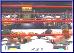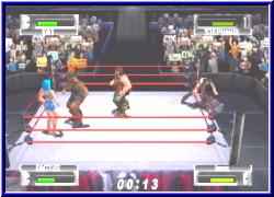 Den Multiplayer Modus kann man natürlich auch einzeln spielen. Als Attraktionen stehen neben dem Exhibition Match auch die Royal Rumble, King of the Ring, Leiter Matches zu Verfügung. Auch seinen eigenen Pay per View Showdown kann man zelebrieren. Und wer schon immer mal Referee bei einem Match sein wollte, kann das nun endlich mal sein. Wie der Kampf nun ausgeht, liegt allein in euren Händen. Natürlich kann man dieses Match auch beeinflussen. Denn für ein Eingreifen ins Geschehen ist immer Zeit. Wenn nun ein Freund aus eurer Vereinigung am verlieren ist, können die drei Pinklopfer gaaaaaaaanz lange dauern. Anders herum geht es natürlich ganz schnell. Für jede dieser Veranstaltungen gibt es verschiedene Matchformen. Ob nun im Einzel- oder Tag Team, als Handicap Match oder Leitermatch, das kann man im Vorfeld alles festlegen. Das absolute Highlight sind natürlich die Leitermatches . Denn ist ein Gegner noch nicht richtig down, kann man es sich schenken die Leiter zu erklimmen. Dann wird der andere mit Sicherheit das Vorhaben vereiteln. Diese Form der Kämpfe sind ähnlich dem Iron Man Match.