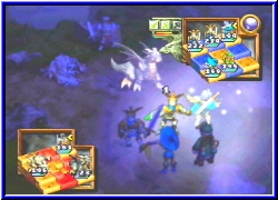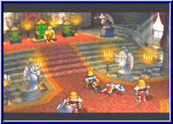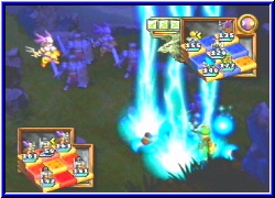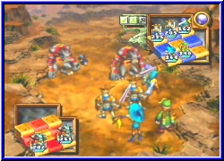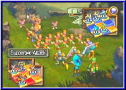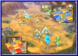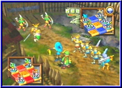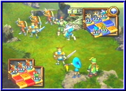 Betritt eine Einheit einer dieser Städte kann man sie betreten und mit den Bewohnern sprechen und so weitere Informationen zur Story bekommen. Desweiteren findet man entweder einen Shop oder eine Art Hexenküche. Der Shop bietet euch die Möglichkeit zumeist seltene Ausrüstungsgegenstände zu kaufen. Die Hexenküche bietet euch die Möglichkeit im Kampf getötete Charaktere einer Unit zurück in das Leben zu holen. Natürlich gegen teures Geld. Dafür gibt es aber auch ein Item, das aber im Shop noch teurer ist. Jede Unit kann man über eine Menu bewegen. Man gibt ihnen jeweils einen Endpunkt. Das kann eine Festung oder Stadt sein, ein beliebiger Punkt auf der Karte oder eine gegnerische Unit, wobei wir beim wichtigsten innerhalb des Spiels sind, wofür man ja auch Stunden im Organize Screen zubringt - den Kämpfen. Überall auf der Karte tummeln sich Gegner, wie auch in manchen Städten und natürlich der gegnerischen Festung. Trifft eine eurer Units auf eine gegnerische Unit kommt der Bildschirm den ich schonmal angsprochen habe zum Vorschein. Denn jetzt zeigen leuchtende Pfeile an wie sich die Gegner gegenüberstehen. Von vorn, der Seite oder ob man einen Gegner von hinten erwischt. Danach beginnt der eigentliche Kampfbildschirm . Die Anordnung der Units ist immer gleich. Eure Unit steht unterhalb und so wie auf dem Viereck angeordnet. Gegnenüber der Gegner. Jeweils an den Seiten sind auch die Vierecke sichtbar. Jetzt aber mit dem HP Zahlen unter den Charakteren. Jetzt kommt der Tiefgang des Spiels erneut zum Tragen. Die Kämpfe laufen im groben selbstständig ab, wobei nun Erfahrungslevel, Ausrüstung, Stellung dafür sorgen das man zuerst angreift oder angegriffen wird. Danach macht jeder Charakter seinen Angriff und geht zurück in die Unit. Trifft er den Gegner erscheint über diesem eine Zahl, die den Schaden des Schlages anzeigt. Gleichzeitig verringert sich die Zahl auf dem Viereck um diesen Treffer. Ist die Zahl bei einem Charakter bei Null stirbt er, was natürlich nur beim Gegner so sein sollte. Es wird solange gekämpft wie jeder Charakter Möglichkeiten hat. Hier kommen also wieder die schon angesprochenen X2 ode X3 Anzeigen zum Tragen. Vor allem die Paladins sind extrem gute Kämpfer. Hinzukommen nun natürlich die Fähigkeiten aller Classes. Habt Ihr einen Zauberer dabei führt er je nach Zauberbuch einen bestimmten Move aus, der entweder einen Gegner einschläfern, paralysieren, vergiften oder sogar versteinern kann. Desweiteren gibt es verschiedene Entwicklungsstufen der sogenannten Healer, die je nach Erfungslevel und Class nur einen oder mehrere Charakter innerhalb eines Kampfes HP Punkte wiedergeben können. Was sehr gefällt das alles in verschiedenen Grafikvariationen erscheint und auch das Auge verwöhnt.
