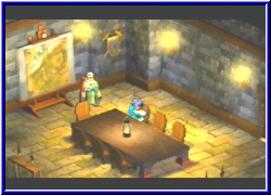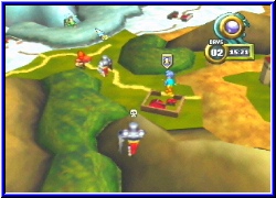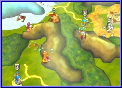 Ihr merkt sicher, ich steigere mich schon wieder in einen Roman. :-) Den man aber locker über das Spiel schreiben kann. Die Anordnung der Charaktere innerhalb einer Unit hat aber noch weitere Auswirkungen. Denn neben den Charakteren hat auch eine Unit Eigenschaften . So gibt es hier die Unterscheidung zwischen Frontstärke, Seiten und Rückstärke, wie auch Angriffswerte und Verteidigung. So kann es sein das Ihr zwar eine extrem starke Unit habt die alles aus dem Weg räumt sobald man eine gegnerische Unit von vorn angreift, aber mörderlich vor die Hunde geht wenn man seitlich angegriffen wird. Das ist echt irre. Denn jetzt stehen die beiden Units sich so im Kampf gegenüber wie es der Aufbau der Unit anzeigt. So kann es nun sein das der Zauberer plötzlich vorn steht und der Paladin hinten und der Kampf einen völlig anderen Ausgang nehmen kann. Natürlich muß es dazu nicht kommen, aber passieren kann es doch. Habt Ihr nun eure Units organisiert geht es an das eigentlich Spielen. Ja das gibts auch noch. :-) Dazu kann man auf der Weltkarte die einzelnen möglichen Scenarios anwählen und wird wie schon erwähnt jedesmal von Hugo dem Taktiker eingewiesen. Er zeigt euch eine Draufsicht der Karte und das Ziel, die gegnerische Festung, sowie Besonderheiten der Gegner oder des Geländes. Hier wie nach einerm Scenarios werdet Ihr im Spiel von unzähligen Sequenzen verwöhnt, die irre viel Text beinhalten und in animierten Umgebungen gezeigt werden. Dabei gefällt hier die schöne Grafik, die ungewöhnlich plastisch daherkommt und stimmungsvoll gemacht ist. Hier wird euch immer wieder Story weiter erzählt. Und hier bekommt Ihr die berühmten Fragen die je nach Antwort den Ausgangs des Spiels entscheiden. Der Spielteil läuft wie schon erwähnt in Echtzeit ab, wobei rechts eine Uhr angezeigt wird mit dem aktuellen Tag des Scenarios. Dabei ist das spielerische in die beiden anderen Spielbildschirme eingeteilt. Zunächst die Field Map in der Ihr eure Units über eine Flache Karte steuert. Dabei erscheinen eure eigenen wie auch die gegnerischen Units nur per Führungscharakter auf der Karte. Auch hier habt Ihr übrigens viele Menupunkte zur Verfügung. Ihr könnt hier auch die Units umorganisieren, mitnehmbare Items nutzen oder auch Items zwischen mehreren Units tauschen, sobald beide innerhalb eines Ortes stehen. Neben eurem und dem gegnerischen Headquarter, das in Form einer Festung daherkommt gibt es meist viele andere kleinere Städte, die entweder neutral sind oder ebenfalls von Gegnern besetzt. Jede dieser Stadt hat bestimmte Eigenschaften. Die Bevölkerungszahl, die Gesinnung innerhalb des Königreiches und bestimmte Gebäude die man seltener findet.