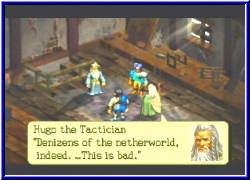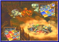 Auf der Field Map sind aber noch weitere Dinge eingearbeitet die den Verlauf beeinflussen. So kann jede Unit auf bestimmten Untergründen besonders gut oder schlecht laufen und kämpfen, bzw der Gegner ist leichter oder schwerer zu besiegen. So sind gegnerische Golems in den Bergen schwer zu besiegen, während sie auf der grünen Wiese schnell das zeitliche segnen. Alles Dinge man beachten muß. Desweiteren findet man beim laufen immer wieder Ausrüstung, die zumeist selten ist. Ebenso wenn man eine gegnerische Unit restlos besiegt gibt es fast immer ein Item, das später verteilt werden kann. Obwohl die Karten nicht besonders große sind kämpft man an einem Scenario gerne mal 1-2 Stunden. Fehlversuche nicht eingerechnet. Denn nicht nur eure Truppen werden immer stärker, sondern auch der Gegner. So können gerne mal bis zu 20 gegnerische Units auf der Karte umherwuseln. Da nicht alle eure Units die gleiche Stärke haben und Ihr eure stärksten Truppen mal am falschen Ort stehen habt werden eure schwachen Units gerne mal erbarmungslos überrannt. Hier heißt es aufpassen. Dazu kommt das in Echtzeit eure Truppen auch mal ermüden. Dazu existiert eine Fahnenanzeige für jede Unit. Ist diese vollständig rot baut die Unit automtisch ein sogenanntes Camp und ruht sich aus. Dann schlafen sie und sind leichte Gegner. Umgedreht natürlich ebenfalls. Und wie das immer so ist kommt diese Schläferstündchen immer im unpassendesten Moment. Auch darauf gilt es ein Auge zu haben. Von Vorteil ist das man dieses Camp auch selber aktivieren kann und somit kurz vor bestimmten markanten Orten die Unit ruhen läßt um sie dann frisch in den Kampf zu schicken. Besiegt man auch den letzten Gegner und nimmt die gegnerische Festung bekommt man zunächst neue Soldaten, einen bestimmten Geldbetrag und eine spezielles Item. Danach gelangt man nach den Sequenzen wieder zur Weltkarte und kann weiterspielen oder im Organize Bildschirm alles mögliche zuweisen und ausprobieren. Wenn man sich überlegt das allein die menschlichen Charaktere über 40 verschiedene Classes erreichen können, dann könnt Ihr ungefähr nachvollziehen wie lange man spielt bis man alle Entwicklungsstufen gesehen hat, geschweige denn erreicht hat. Das ganze wird dazu von einer sehr mystischen und stimmungsvollen Musik begleitet die immer zum Geschehen paßt. Vom Potential ein Spiel wie Zelda oder BT. Tür zu - Spiel an und man ward lange nicht mehr gesehen. :-) Zumal es in diesem Genre keine Konkurrenz gibt. Aber selbst vor der bräuchte sich das Spiel nicht verstecken. Denn alle Aspekte habe ich garnicht beschrieben und vor allem alle Endings bei weitem noch nicht gesehen.