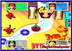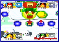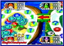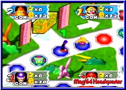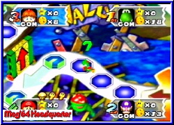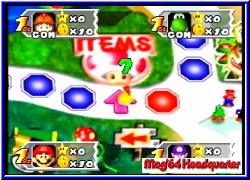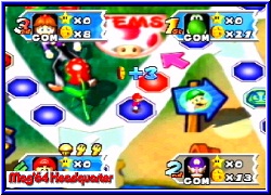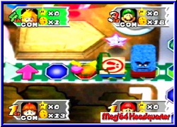 Es geht los mit dem Giftpilz, den man den Gegenspielern zuweisen kann und der es ihnen nur erlaubt bis zu 3 Schritten im nächsten Turn zu würfeln. Danach folgt der Umkehrpilz, der es euch oder anderen Spielern erlaubt die gewürfelte Zahl rückwärts zu gehen. Vorteil ist das man Abzweige die man normal nicht gehen kann so erreicht. Ebenfalls neu sind 2 Handys. Mit ihnen kann man jeweils Bowser oder Toad rufen und so deren Aktionen einem Spieler zuschustern oder selber nutzen, wie bei Toad wo man so den kompletten Shop rufen kann. Hinterlistig ist die blaue Lampe mit der man eine Fee erscheinen läßt die den Standort des Sterns auf dem Brett verändert. Der "gutmütige" Blick eines Mitspielers der direkt davor stand ist euch sicher. :-) Wem der ewige Sterneklau auf den Geist ging bekommt nun eine Spraydose die verhindert das einem ein Stern beim Buhu oder in der Chance Time gestohlen wird. Im richtigen Moment ein wirksames Mittel um sich den Sieg zu sichern. Bei beiden Shopvarianten zu finden sind die Überraschungspakete. Hier kauft man gleich 3 Items ohne aber zu wissen was drin ist. 3 Items?? Ja genau. Eine der sinnvollsten Neuerungen ist das die Spieler nun maximal 3 Items gleichzeitig mitnehmen können. Man kann also nun horten was das Zeug hält. Zu guter letzt gibt es noch 4 Super Items, die man nicht kaufen kann sondern nur über eines der Toadfelder auf den Brettern bekommen kann. Hier erscheint Toad, der euch nun entweder bis zu 3 normalen Items schenkt oder eben eines dieser Super Items. Mit ihnen kann man nun z.b. die Bank sofort ausräumen oder aber auch einen Spieler seiner Wahl zu einem Shy Guy Feld lotsen. Auf jeden Fall sorgen die neuen Items und die Tatsache 3 Items gleichzeitig mitzunehmen dafür das der Spielspaß immens gehoben wird, weil die Möglichkeiten Schabernack mit sich und den Mitspielern zu treiben sehr viel höher sind. Auch bei uns war nach den ersten Brettern sofort klar das dieser Teil der mit Abstand beste Party Teil ist. Jedes Feld das die Spieler betreten besitzt eine farbliche Wertigkeit. Blau oder Rot, was nach Abschluß einer Runde wenn alle 4 gewürfelt und gezogen haben das Herzstück eines jeden Mario Party Spiels hervorzaubert, die Minispiele . So gibt es auch hier wieder die 4P Minispiele , oder es spielen jeweils Pärchen in einem 2-2 Minispiel oder aber einer spielt allein gegen die 3 anderen in einem 3-1 Minispiel. Neu in Mario Party 3 ist nun das es insgesamt 70 dieser Minispiele gibt. Noch besser ist die Tatsache das alle 70 komplett neu designt sind und alle Premieren feiern. Hatte man im 2er ab und zu ähnliche aus dem ersten Teil so heißt es hier auf jeden Fall umdenken.