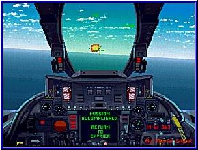 Kurze Beschreibung zum Cockpit: In der Mitte über dem Hauptbildschirm ist die leuchte, wenn Ihr ein Feindlichen Flieger im Ziel habt. Rechts und links neben dem Hauptfenster ist unsere Schadensanzeige. Gleich Rechts neben dem Hauptbildschirm, in der Mitte, ist die Temperaturanzeige für das M61A1(unsere Bordkanone). Ganz rechts ist unsere Waffenstatus Anzeige, die Anzeige zeigt uns die Aktuelle Waffe an. Ganz oben ist unsere Peilungsgenauigkeit der F-14. Und rechts in der Frontscheibenanzeige ist die Flughöhe unserer F-14. Und das waren die Cockpiksimbole jetzt können wir loslegen und die ersten MIGS abschiessen. Es gebt drei verschiedene Levelarten, die erste ist am tage fliegen, die zweite beim Sonnenuntergang fliegen und dann gibt es noch coolen Nachtmissionen.