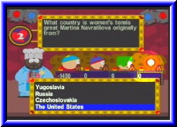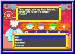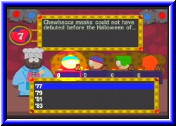 | Euch werden jeweils drei Kategorien vorgeschlagen und wenn ihr euch in der vorgegebenen Zeit nicht entscheidet, dann macht das Chef für euch. Zu jeder Frage gibt es vier mögliche Antworten, von denen drei mit Sicherheit falsch sind. Nur welche??? Wer zuerst den imaginären Buzzer (A-Knopf) schlägt, hat das Recht die Frage zu beantworten. Nur ist die Zeit sehr knapp bemessen, um die Frage und die Antworten zu lesen und auch noch die richtige Antwort zu finden. Im Mehrspielermodus kann man natürlich auch einen Konkurrenten auf den Docht gehen. Man schlägt den Buzzer und statt selber zu antworten, gibt man die Frage an einen anderen weiter. Der muß dann antworten und bekommt für die richtige Antwort die doppelte Punktzahl oder eben das doppelte abgezogen. Da lassen sich miese Spielchen treiben. Nicht immer verbergen sich Fragen hinter den Kategorien. Da passiert es schon mal, das das Glücksrad zum Vorschein kommt, an dem alles passieren kann. 1000 Bonuspunkte, minus 1000 Pkt. oder auch einfach nichts. Wenn man Glück (oder auch Pech) hat, erwischt man das Doppel. Hier heißt es "Risiko" !!! Man legt hier selber den Preis für die Frage fest. Wie fragte einst Frank Elstner in seiner Show? "Wieviel wollen sie setzen" ??? Nun seid ihr in diesem Konflikt. Ihr kennt zwar die Kategorie, aber nicht die Frage. Nach jeder Runde gibt es den Nachschlag. Ein Minigame. Hier kann jeder seinen Punktestand nach oben oder unten korrigieren. Die Minigames sind zwar primitiv aber nicht unbedingt leicht. Sie haben Namen, die sich an der guten South Park Mundart orientieren. Beispiele??? Da wäre zum Bsp. "Ärsche im Weltall", "Zombieklatschen" oder auch "Affentanz mit Mr. Mackey". Ihr müßt in der vorgegebenen Zeit die Spiele überstehen und auch noch so viele Punkte wie möglich einfahren. Vor dem Spiel erfahrt ihr den Inhalt und die Tastenbelegung und schon geht es rund. Nach jedem Minispiel bekommt ihr die Endabrechnung präsentiert und den aktuellen Spielstand mit den jeweiligen Platzierungen. Nach Absolvierung der eingestellten Runden kommt die Siegerehrung und es ist Zeit sich zu freuen oder zu ärgern. |