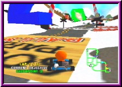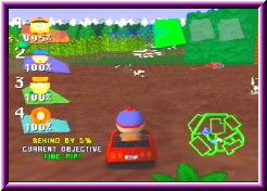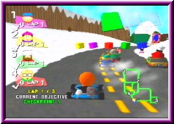 | Um im Arcade Modus alle Rennen bestreiten zu können, muß man erst im Meisterschaftsmodus die Strecken freigefahren haben. Dann stehen einem aber auch 15 Kurse mit deren Aufgaben zur Verfügung. Also machen wir uns im Meisterschafts Modus auf die Socken um die Kurse zu erfahren. Dazu wählen wir einen von anfänglich 8 Charakteren aus. Darunter sind natürlich die vier Katastophen Kids Stan, Kyle, Cartman und der ewig verlierende Kenny. Alle Beteiligten fahren einen anderen Untersatz. Vom Kart über das Polizeiauto von Officer Barbrady hin zu Stanīs Ferarri. Leistungsmäßig wirkt sich das aber kaum aus. In einem Rundflug über den Kurs wird uns das Ziel optisch, akustisch und auch textural erklärt. Im Vorbeifliegen sieht man auch diverse Kisten auf der Strecke liegen, die den gleichen zweck erfüllen, wie bei Mario Kart. Damit kann man seine Mitstreiter ganz schön ärgern. Darunter befinden sich Sachen wie, Würg (Erbrochenes), explosiver Durchfall (...), Analsonden und der gleichen. Man sieht, die Programmierer waren sich nicht zu schade, sich an die South Park typischen ekligen Gegebenheiten zu halten. Hat man sich in etwa mit der Streckenführung vertraut gemacht, kann es ja losgehen. Rechts am Bildschirmrand sieht man die derzeitige Platzierung der Fahrer mit ihren schon abgerissenen Runden. Oben sehen wir das "Waffenarsenal" der mitgeführten Überraschungen. Rechts unten haben wir eine Karte, wo wir genau sehen, wo sich wer befindet. Ein transparenter Pfeil in der Bildmitte zeigt uns den rechten Weg zum nächsten Objekt. |