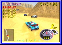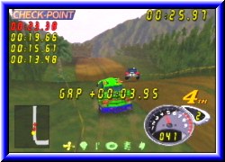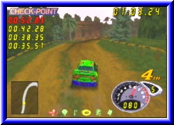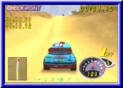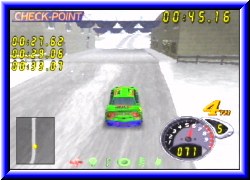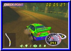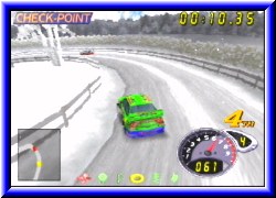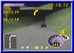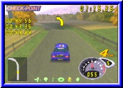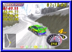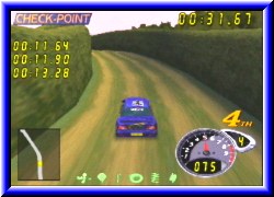 | Denn z.b. mit Slicks im Regen oder auf Eis zu fahren läßt die Gewinnchance auf 0 abfallen. Danach kann man vor jeden Rennen die Lenkwirkung verstellen und es geht los. Ihr fahrt gegen 3 Gegner, die alle zu unterschiedlichen Zeiten starten. Ihr steht alle in der Startaufstellung und einer nach dem anderen fährt los. Nun gilt es die verschiedensten Checkpoints auf der Strecke in der Summierung der Zwischenzeiten als erstes zu durchfahren. Ob Ihr Rückstand habt, welchen Platz gerade oder auch welchen Vorsprung das wird euch auf dem Screen angezeigt. Desweiteren seht Ihr eine Karte die den Streckenverlauf anzeigt und die obligatorischen Anzeigen, wie Tacho oder Drehzahlmesser. Am unteren Bildschirmrand exestieren nun 5 Anzeigen, die den Zustand eures Wagen dokumentieren. Von den Reifen, über die Federung bis zum Motor ist alles dabei. Im Top Zustand erscheinen die Symbole alle in grün. Räubert Ihr aber z.b. zu sehr über Kanten verändern sich die Farben und es liegt an euch ein kaputtes Teil zu riskieren oder nicht. Ein wie ich finde einmaliges Feature. Denn so kann z.b. mitten im Rennen ein Reifen platzen, der Motor überhitzen oder die Federung zusammenbrechen. Das alles wirkt sich natürlich auf eure Zeit aus. Extrem beim Reifenplatzer, wo der Wagen kurz an den Rand fährt und ein Reifenwechsel vonstatten geht. Das kostet meist wertvolle Zeit. Doch es kommt noch extremer. Nehmen wir an im Rennen ist die Federung gebrochen. Nach einem Rennen könnt Ihr nun den Werkstattwagen aufsuchen um das zu reparieren. Das kostet hier kein Geld. Dafür wird euch Strafzeit aufgebrummt. So kann es sein das Ihr belastet mit 10 Sekunden das nächste Rennen angeht und diese immer auf eure Zeit dazu addiert wird. Also heizen auf Teufel komm raus ist hier der falsche Weg. Natürlich ist hier Voraussetzung das die Steuerung im Spiel dies auch unterstützt. Hier zeigt sich ein differenziertes Bild. Je stärker ein Wagen ist und wie schnell ist er immer schwerer zu steuern. Die Herausforderungen der Strecken sind also gleichlaufend mit denen der Steuerung. Die Steuerung ist an sich nicht ganz so sensibel wie in V-Rally '99, aber trotzdem sensibel genug um genug Unsinn zu fabrizieren. |