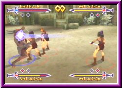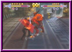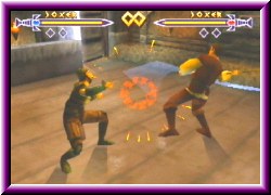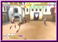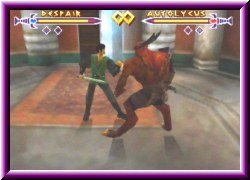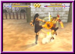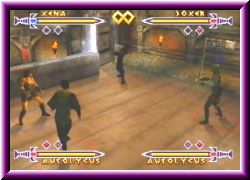 | Während Xena z.b. relativ flink mit ihrem Schwert umgeht läßt sich Joxer z.b. mehr Zeit. Trotzdem will zu beginn nicht so das richtige Prügelfieber aufkommen. Gerade weil man Specials eher durch Zufall erwischt als gezielt einsetzt. Und nur mit den normalen Schlägen und Tritten ist es zwar schnell und hektisch, endet aber schnell in Eintönigkeit. Also Schluß mit Training und ab in den Quest Modus. Hier wählt Ihr nun euren Charakter aus. Besonderheit und ein Pluspunkt im Spiel ist die Möglichkeit mit 2 Spielern den Quest Modus zu spielen. In diesem geht es darum nacheinander alle Kontrahenten aus dem Weg zu räumen und am Ende dem großen Despair gegenüber zu treten und die Kontrolle über den Talisman of Fate zu erlangen. Wie in allen Prüglern stellen sich bei Gegner zu beginn vor. Jeder verfügt über eine Energieleiste, die es nun durch gute Aktionen auf Null zu bringen gilt. Jeder Charakter im Spiel auf den Ihr trefft besitzt seinen eigenen Hintergrund. Grafisch ist Xena sicher nicht schlecht. Ich empfinde aber einen Dark Rift oder Mace: The Dark Age nicht schlechter. Die Hintergründe sind meist starr und nur vereinzelt lodert eine Fackel oder sonstiges. Cool ist Caesars Stage, die in einer Gladiatoren Arena stattfindet. Hier kommen vor allem die Caesar Rufe von den Rängen gut. Überhaupt ist der Sound recht gut gelungen. Die Musikstücke sind eindringlich und passen zur Atmosphäre. Aber auch hier merkt man schnell das doch etwas eintönige spielen. Zumindest allein fegt man mehr oder weniger schnell durch die Kämpfe. Im Easy und Medium seid Ihr in weniger als 10 Minuten durch. Dafür ist das Ende immer sehr interessant. Hat man Despair im Entscheidungskampf besiegt bekommt man als Belohnung immer einen Cheat in Form einer Tastenkombination. Erst ab dem Modus Hard macht Xena mehr Spaß. Nämlich weil man sich jetzt in jeder Stage 2 Gegnern gegenübersieht. Ebenso klappen ganz langsam die ersten Specials. Diese sind grafisch gut umgesetzt, setzen aber ebenfalls keine Maßstäbe. Spielt man hier zu zweit macht das ganze dann natürlich noch mehr Spaß. |
